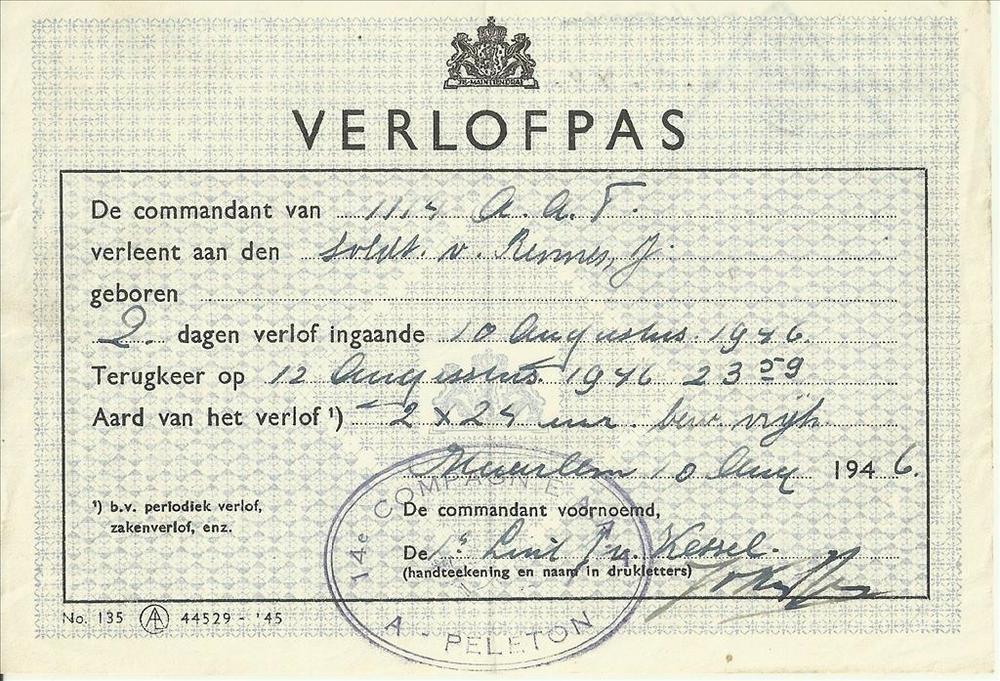 Verlofpas op naam van soldaat v. Rennes