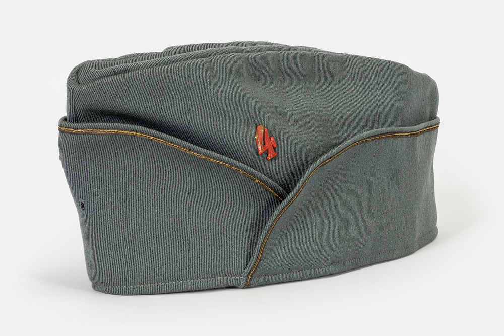 Veldmuts, groen/grijs, goudkleurige bies, rood cijfer 4