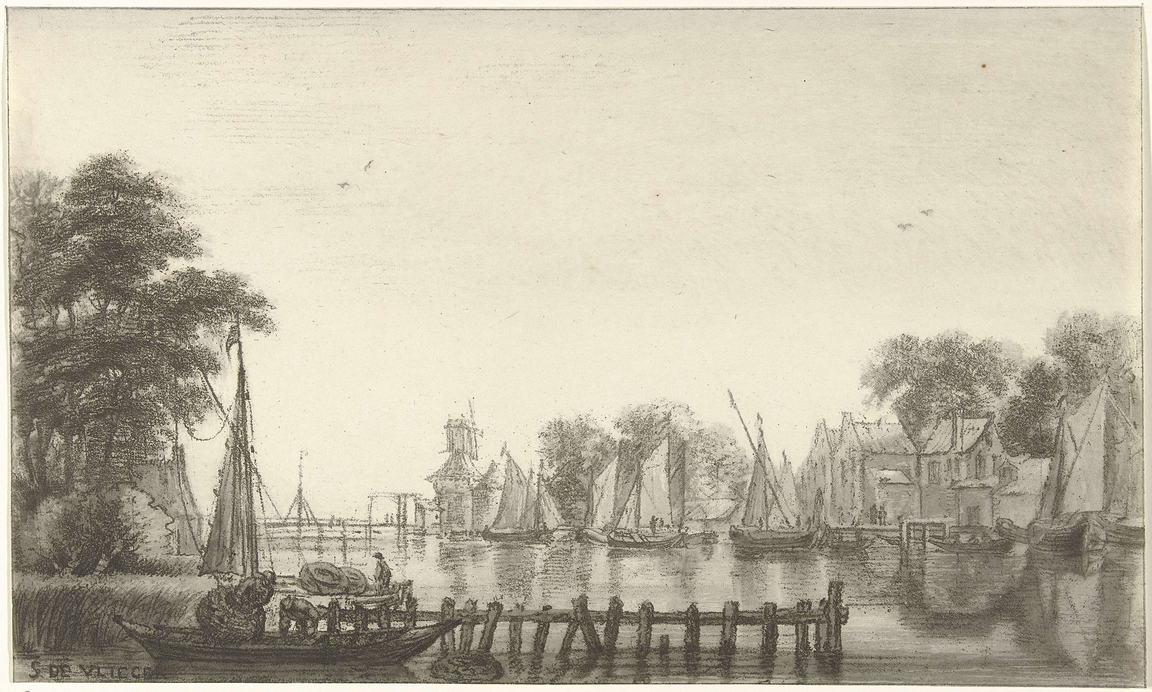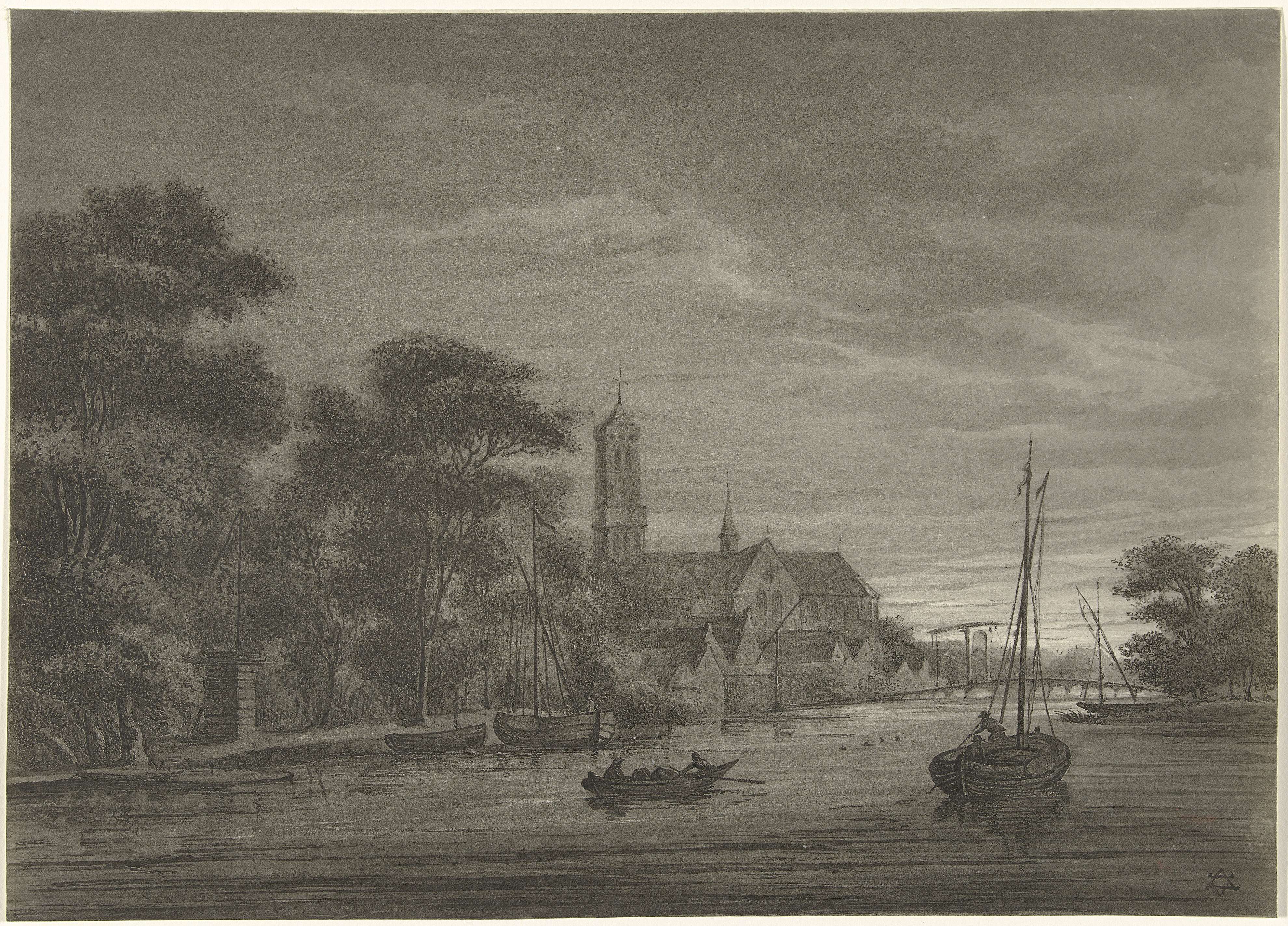 Riviergezicht met zeilschepen