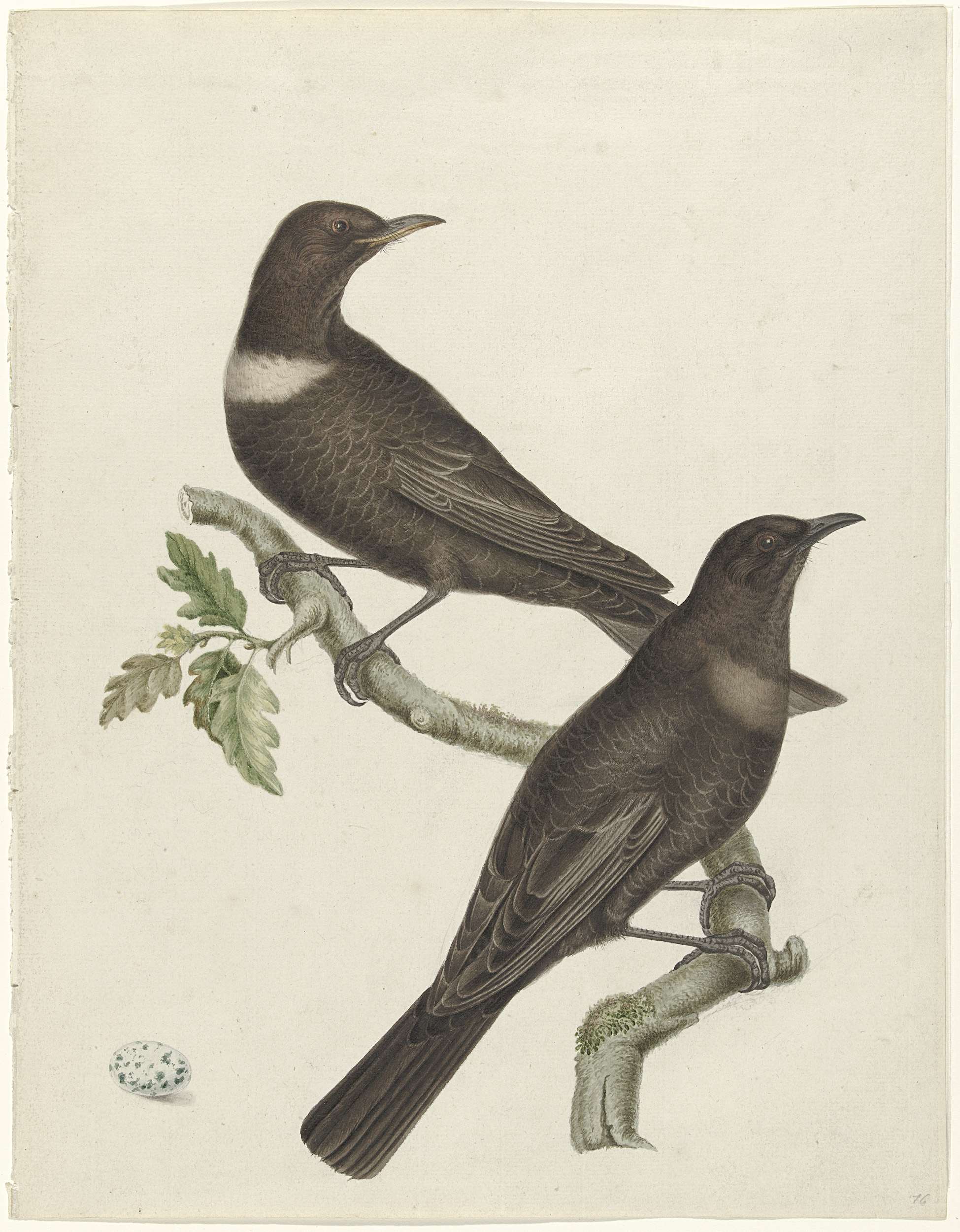 Twee beflijsters (Turdus torquatus) met een ei