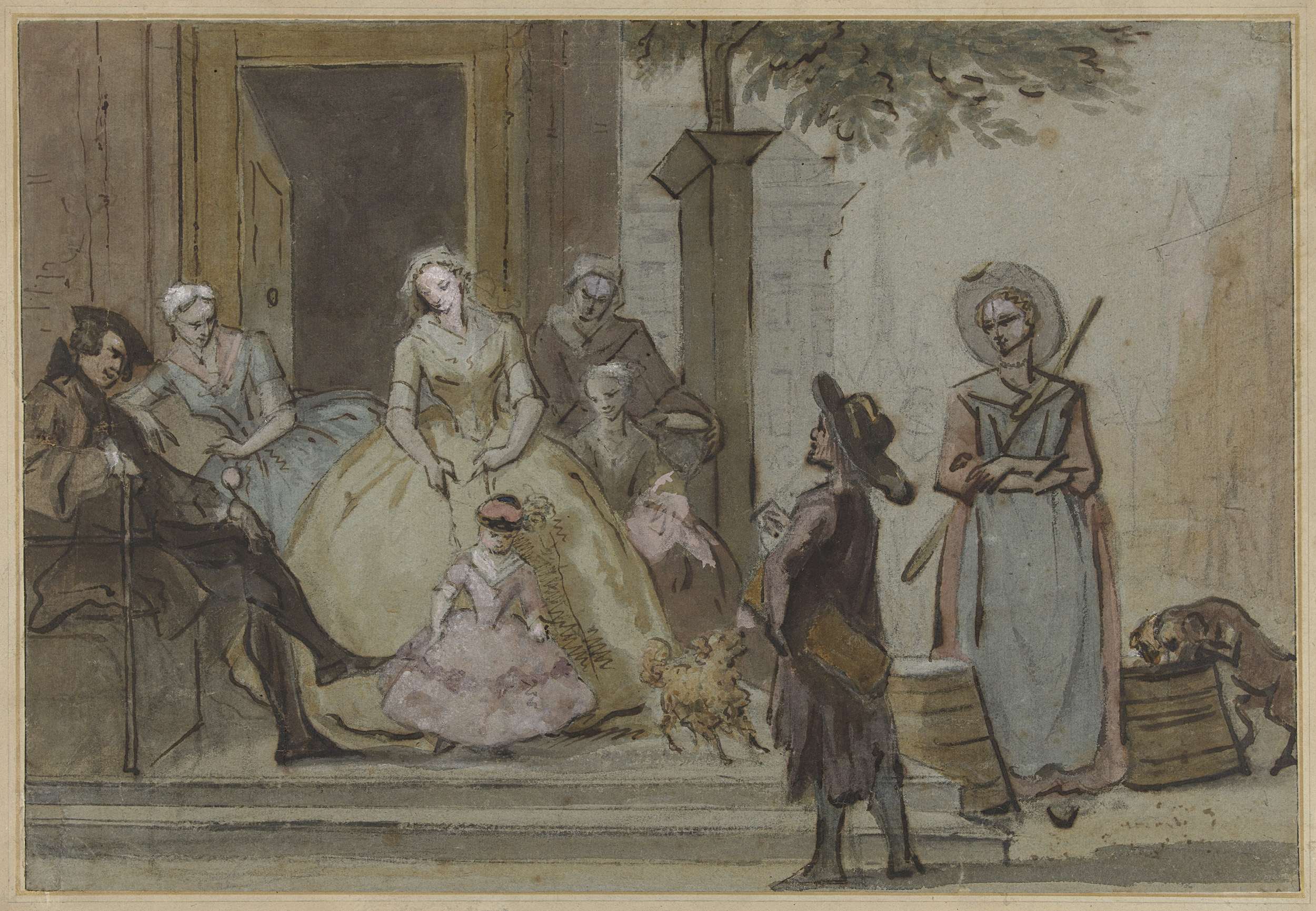Draailier-speler voor een luisterende familie op de ...