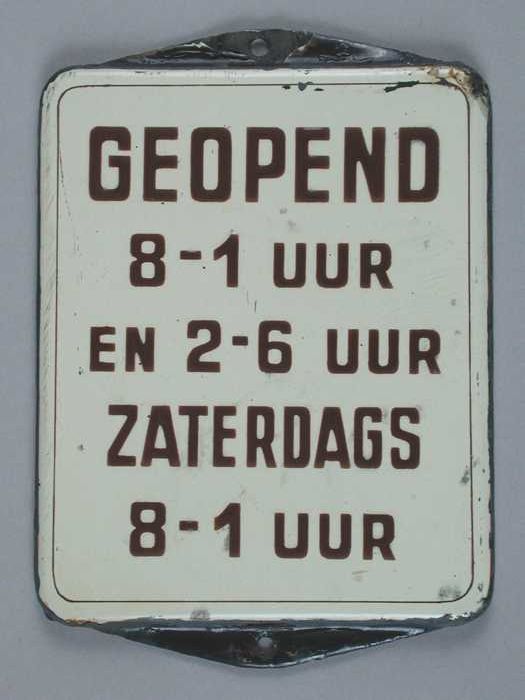 Rechthoekig emaille bordje met openingstijden "Geope...