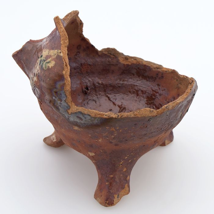 Kookkan op drie poten van rood aardewerk, loodglazuu...