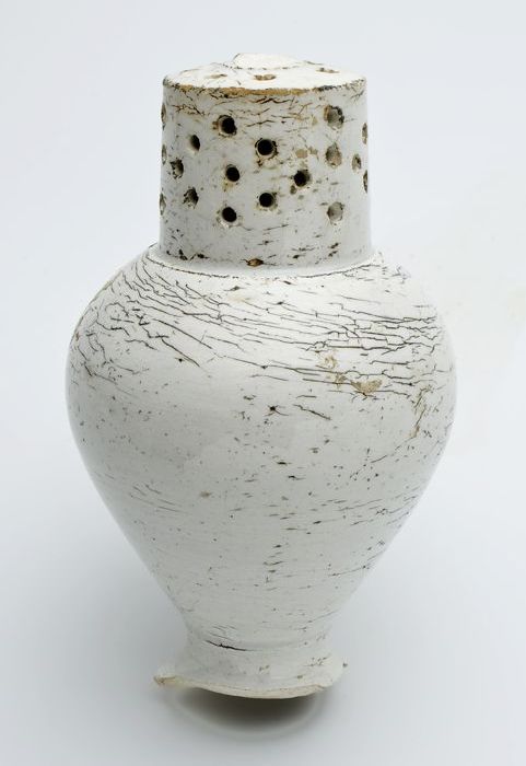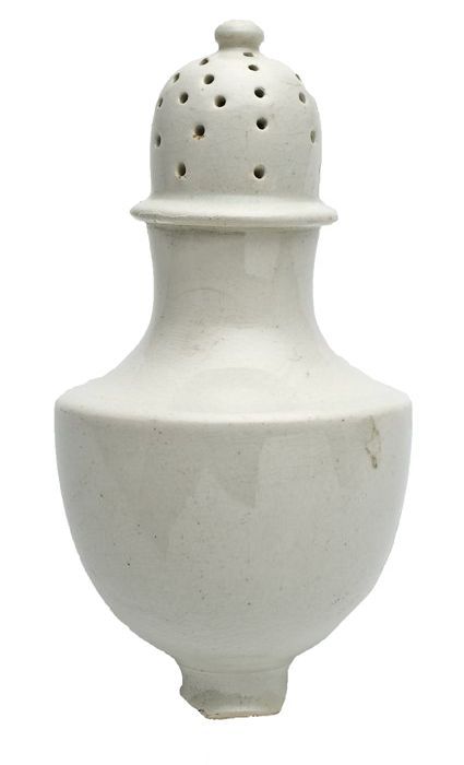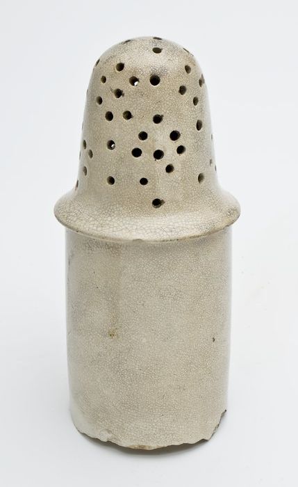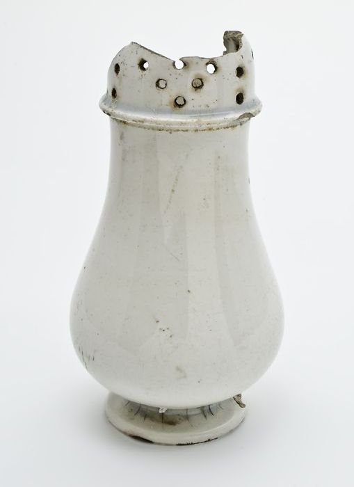 Porseleinen strooier, cilindrisch en wit, klokvormig...