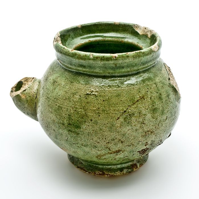 Kleine aardewerken theepot, groen geglazuurd, speelgoed