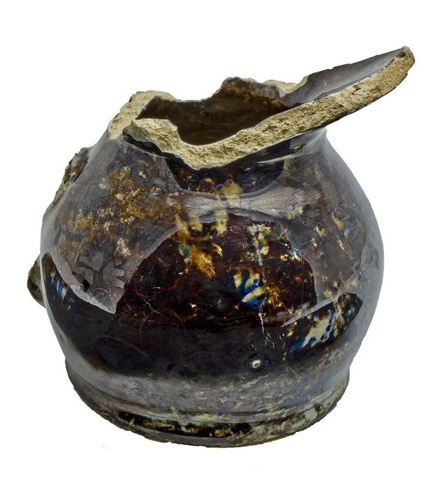Aardewerken deksel van doofpot, paars / zwart geglaz...