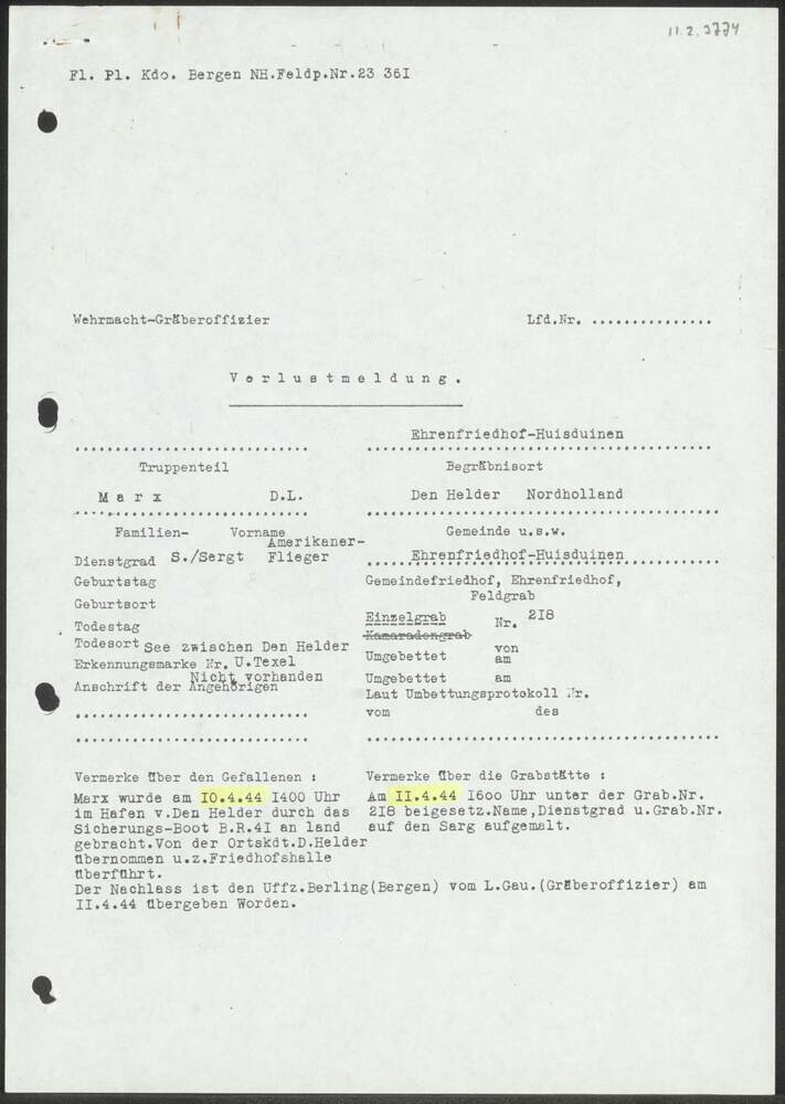Verlustmeldung Fl.Pl.Kdo. Bergen N.H. 10 april 1944.