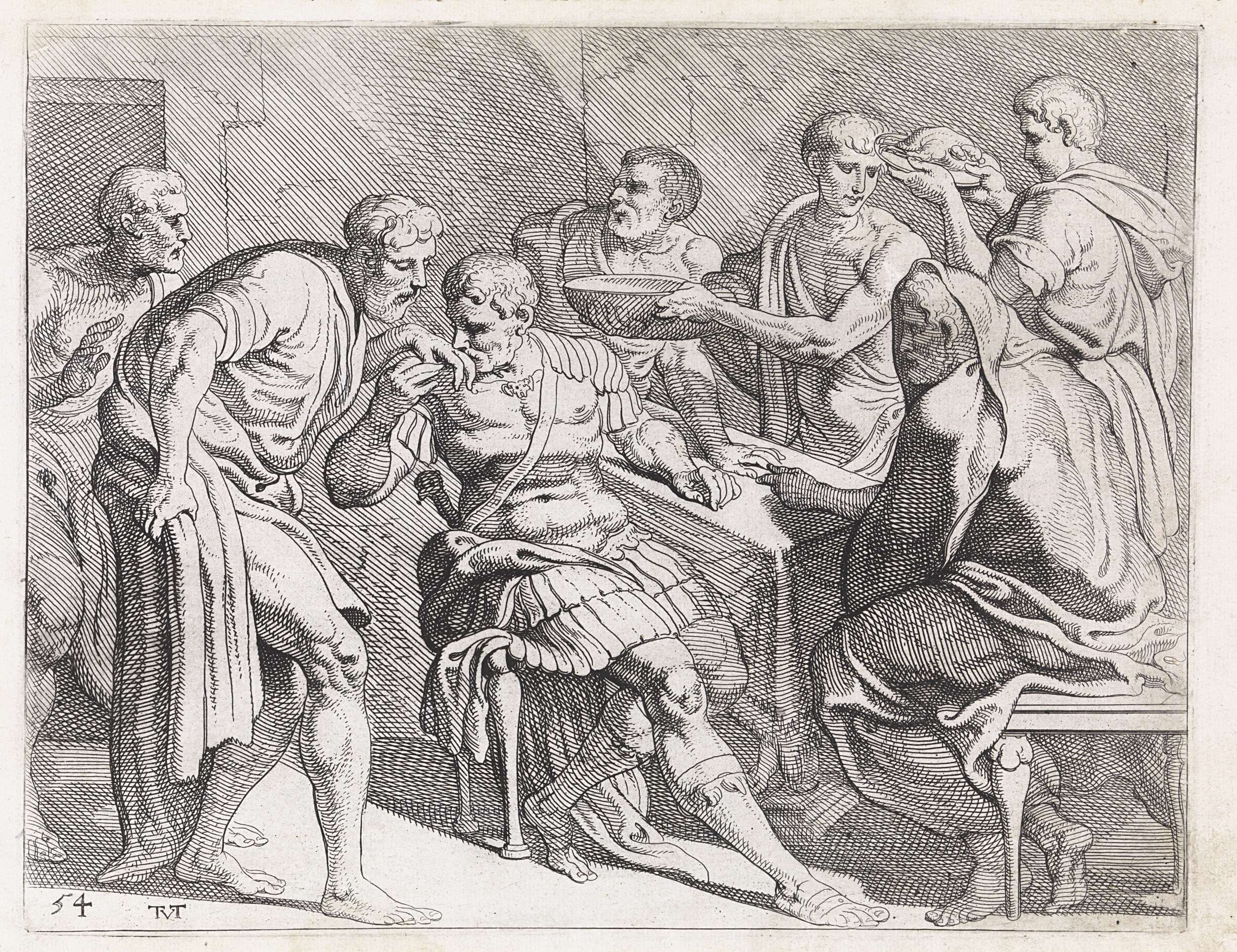 Odysseus krijgt een aalmoes van een van zijn bedienden