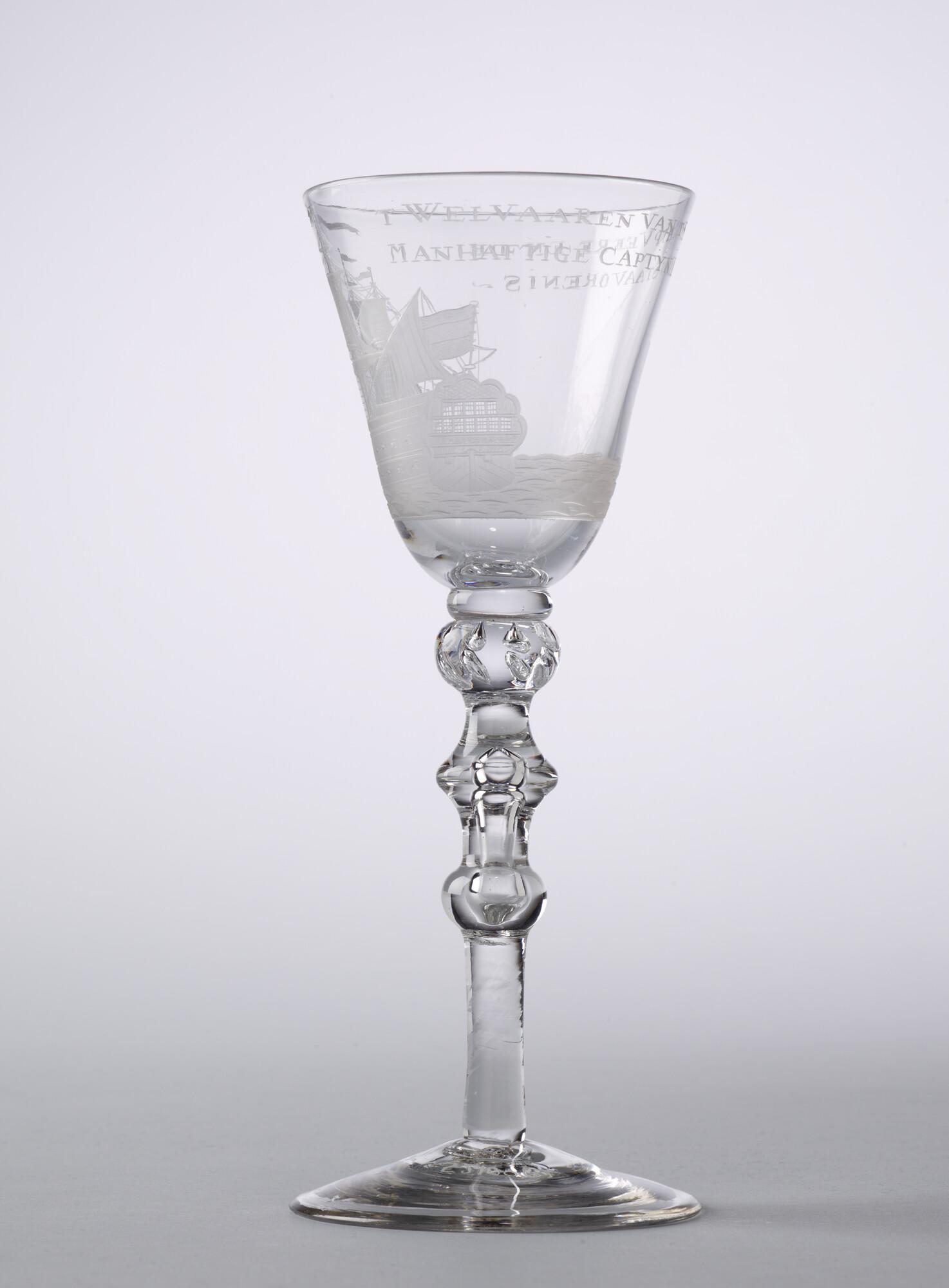 Kelkglas met radgravure van een driemaster en het op...