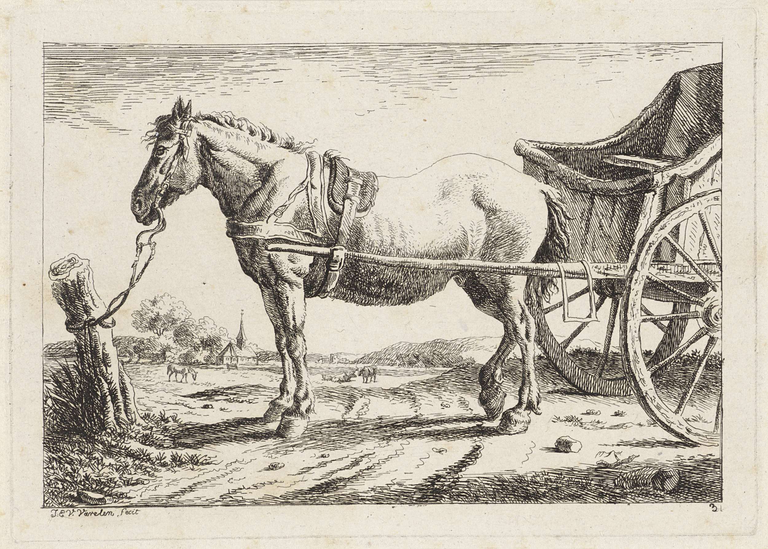 Staand paard, voor een wagen gespannen