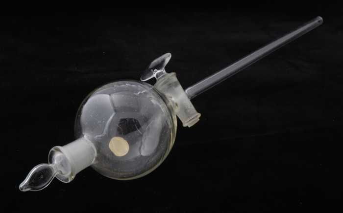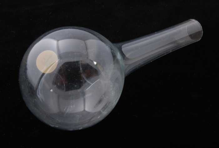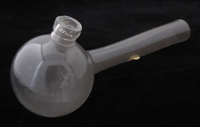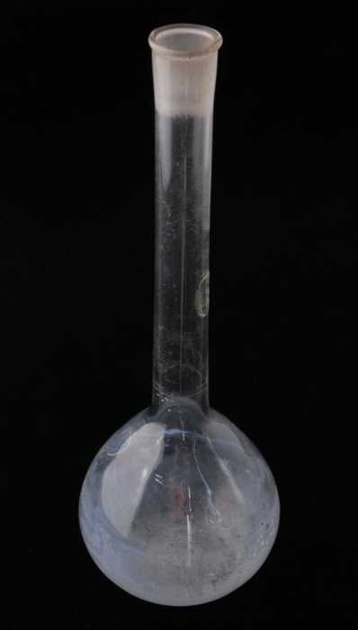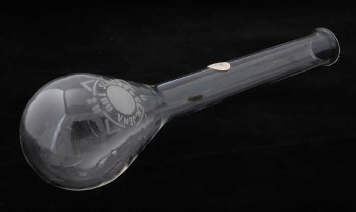 Glazen kolf met ronde bodem en zijarm, gebruikt in a...