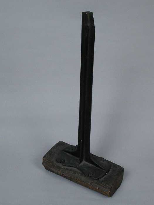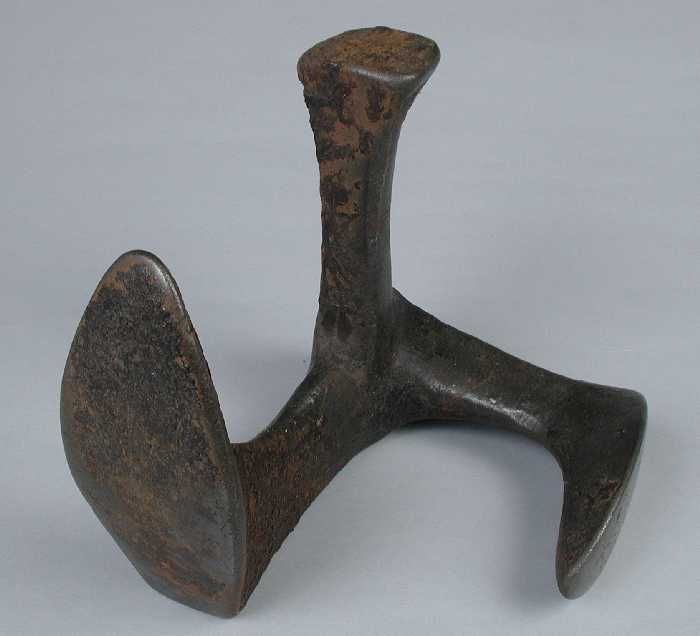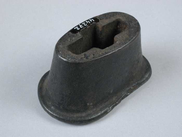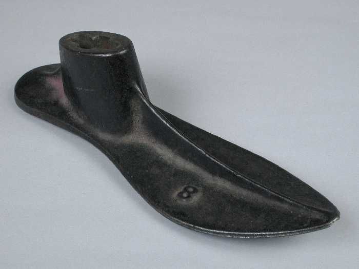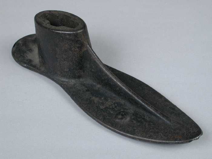 Zware metalen drievoet, met aan elke voet een leest,...