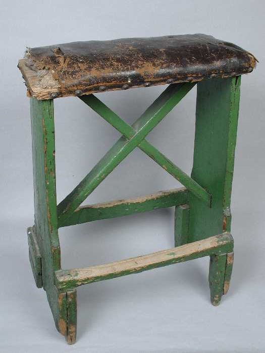 Langwerpig groengeverfd houten krukje met leren zitt...