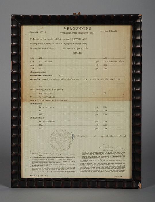 Ingelijste vergunning op naam van schoenmaker Koster...