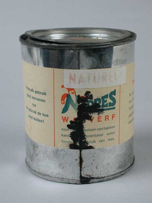 Metaalkleurig blik met etiket "Nedres wasverf", gebr...