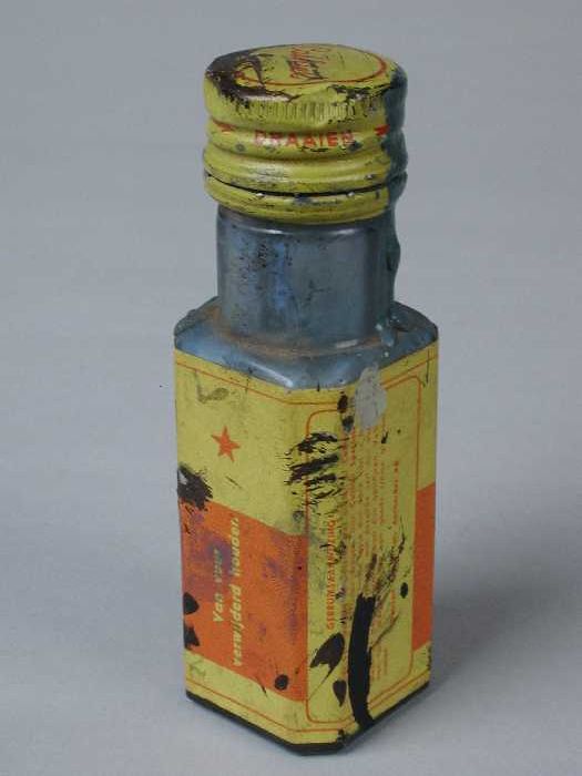 Glazen flesje met metalen schroefdop en geel etiket ...