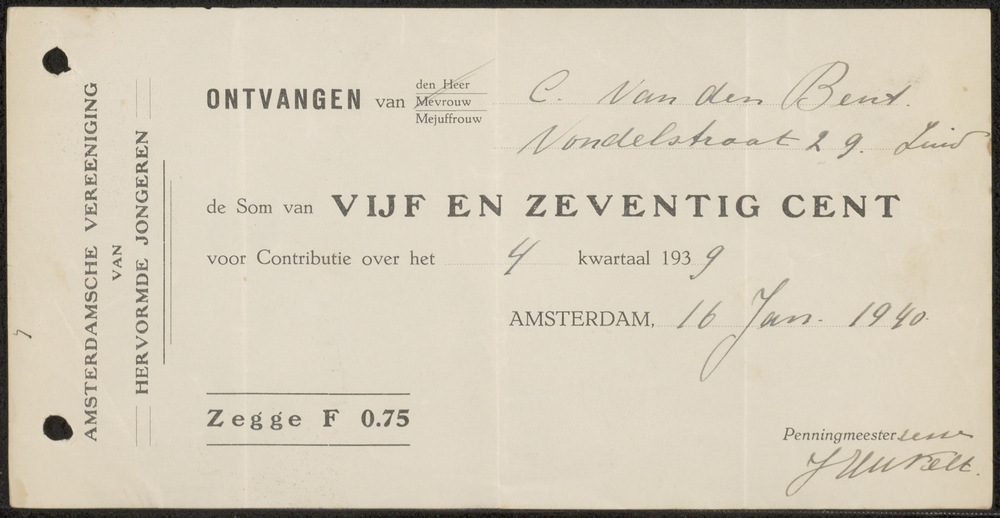 Kwitantie van Amsterdams Vereeninging van Hervormde ...