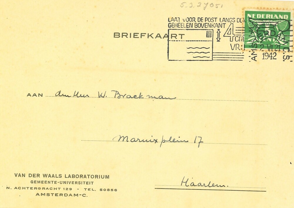 Briefkaart voor dhr Brackman te Haarlem