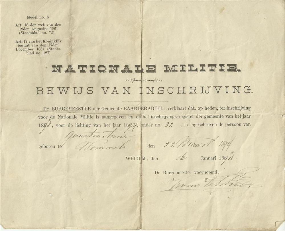 bewijs van inschrijving - Nationale Militie - lichti...