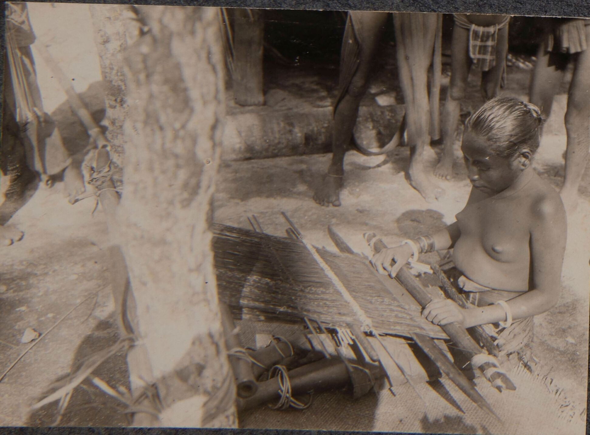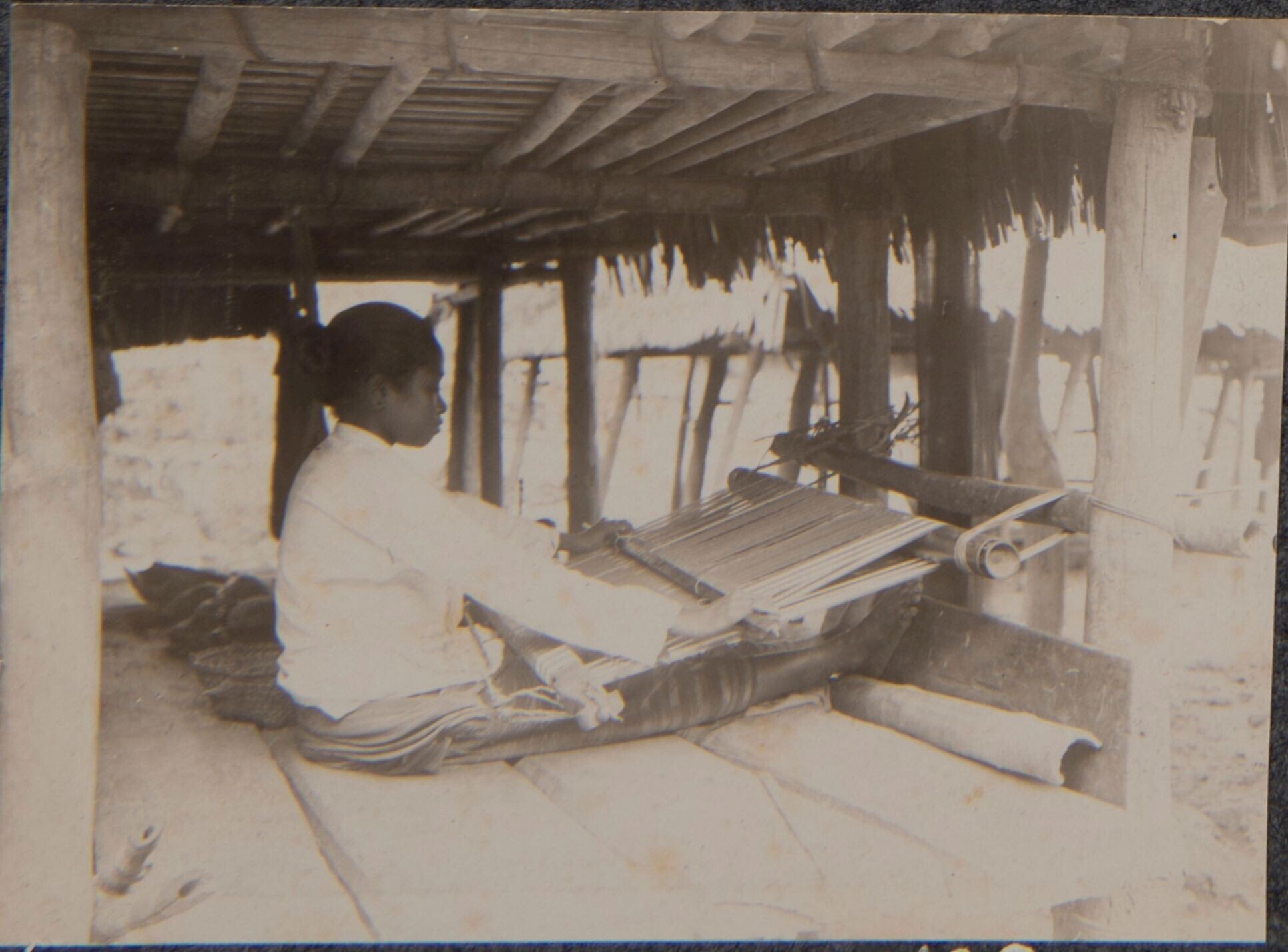 Een Tanimbar vrouw werkt aan een weefgetouw