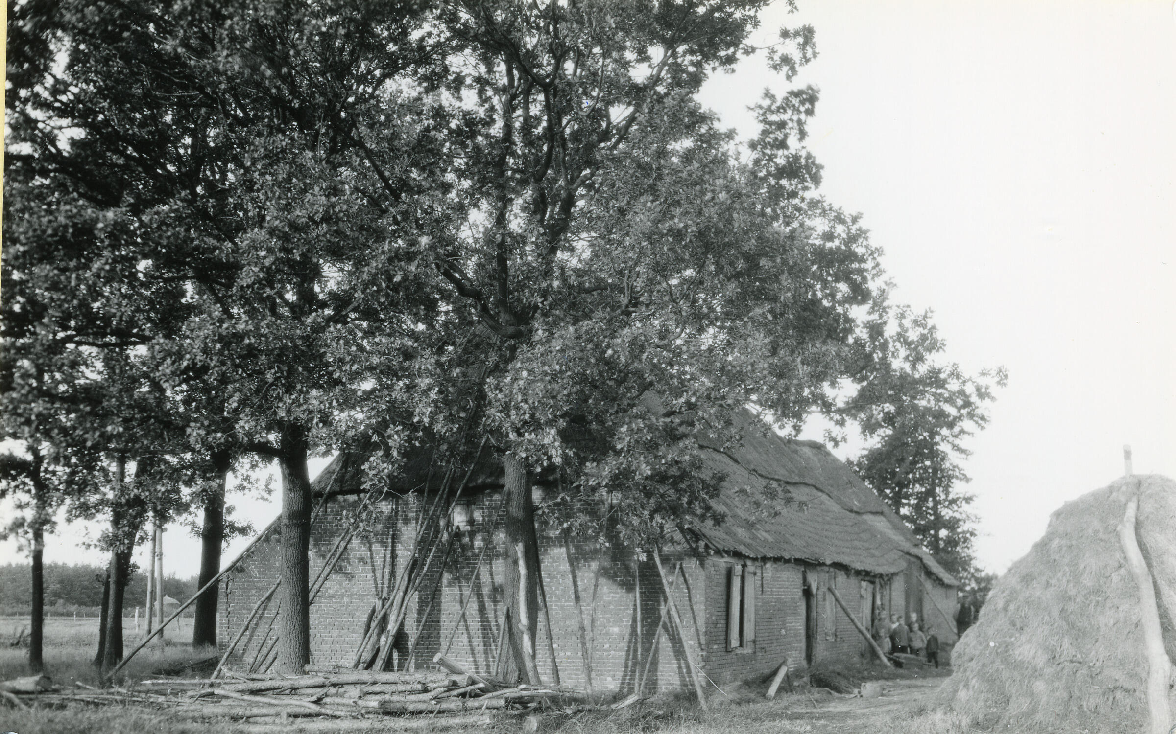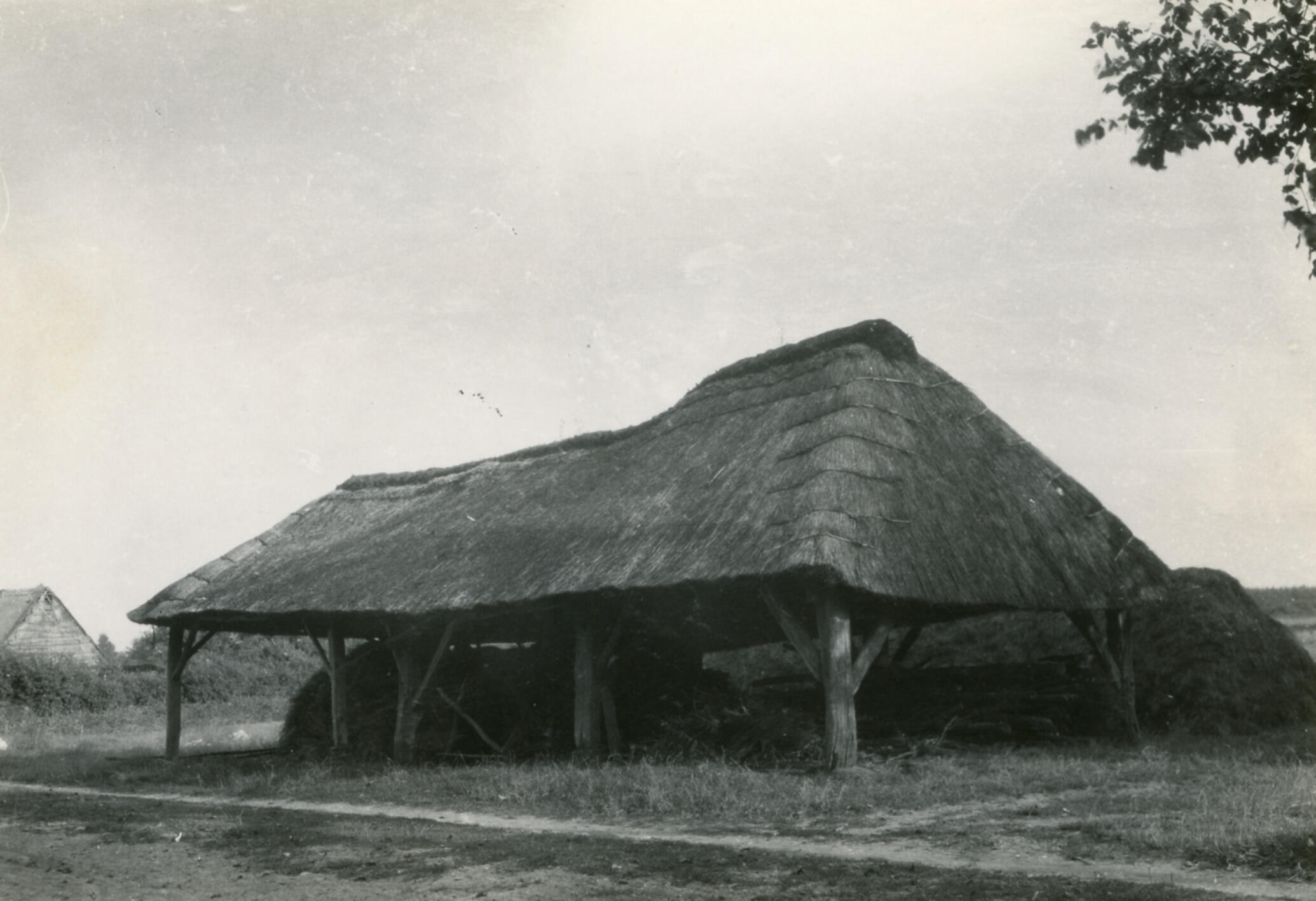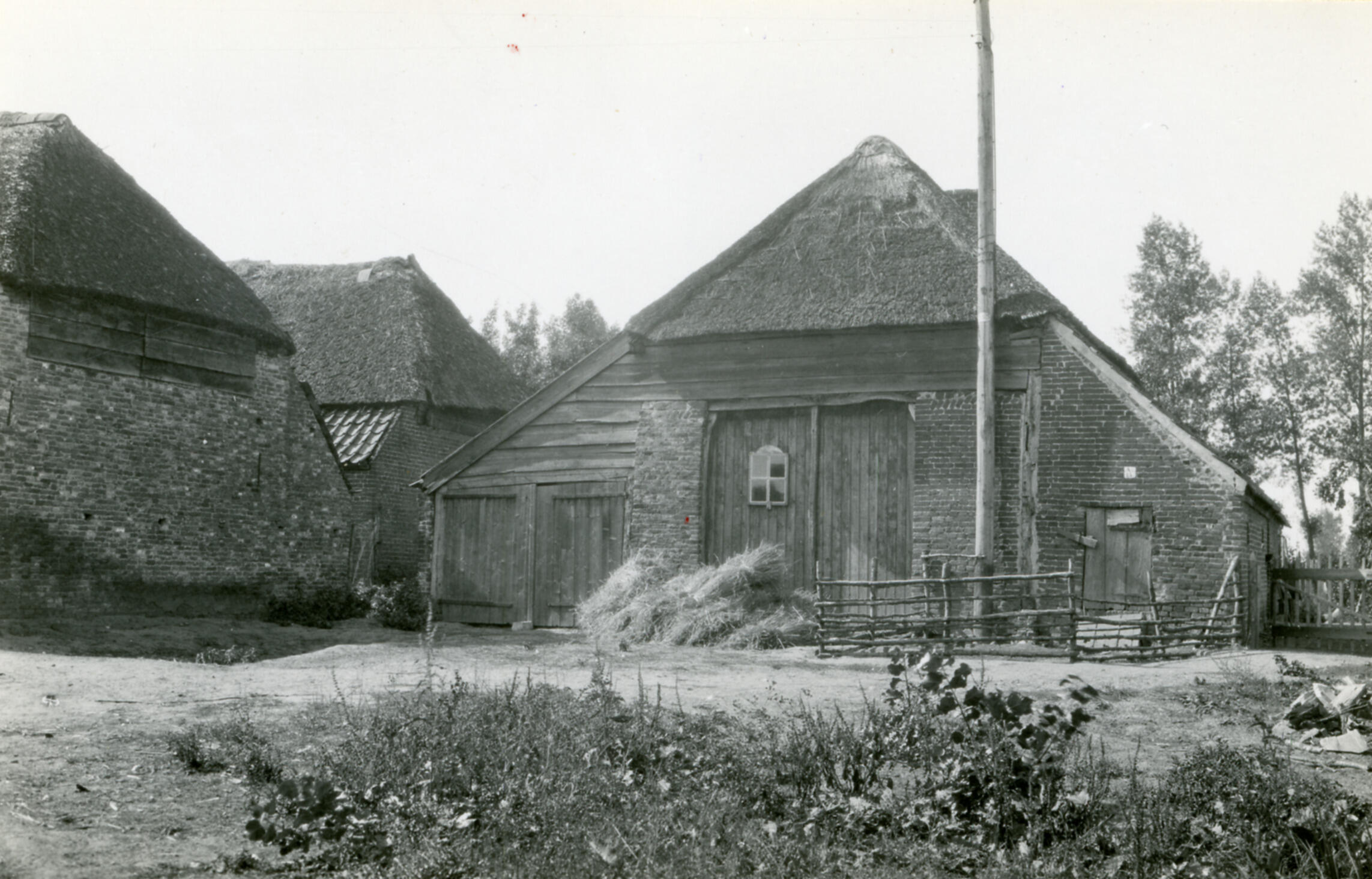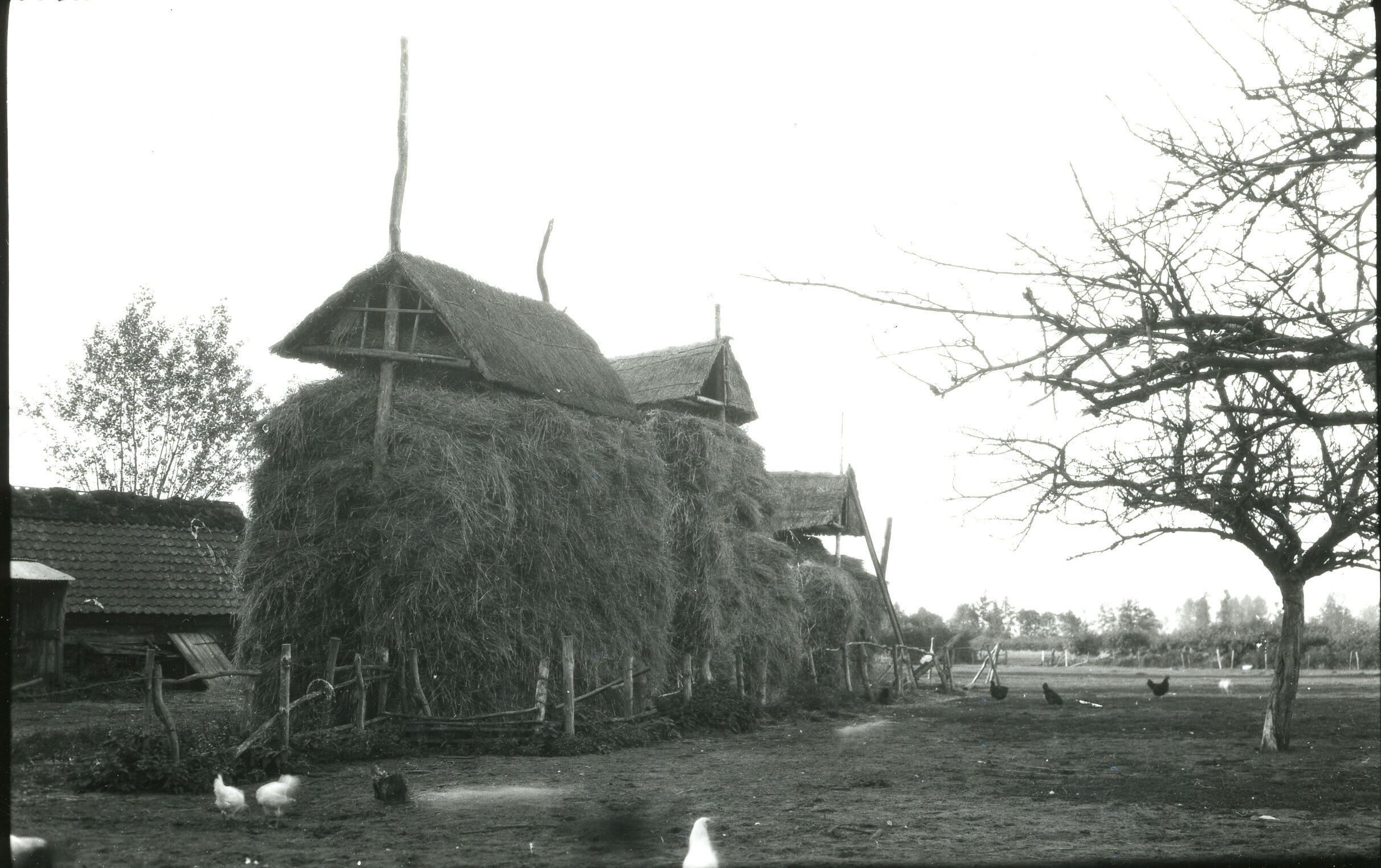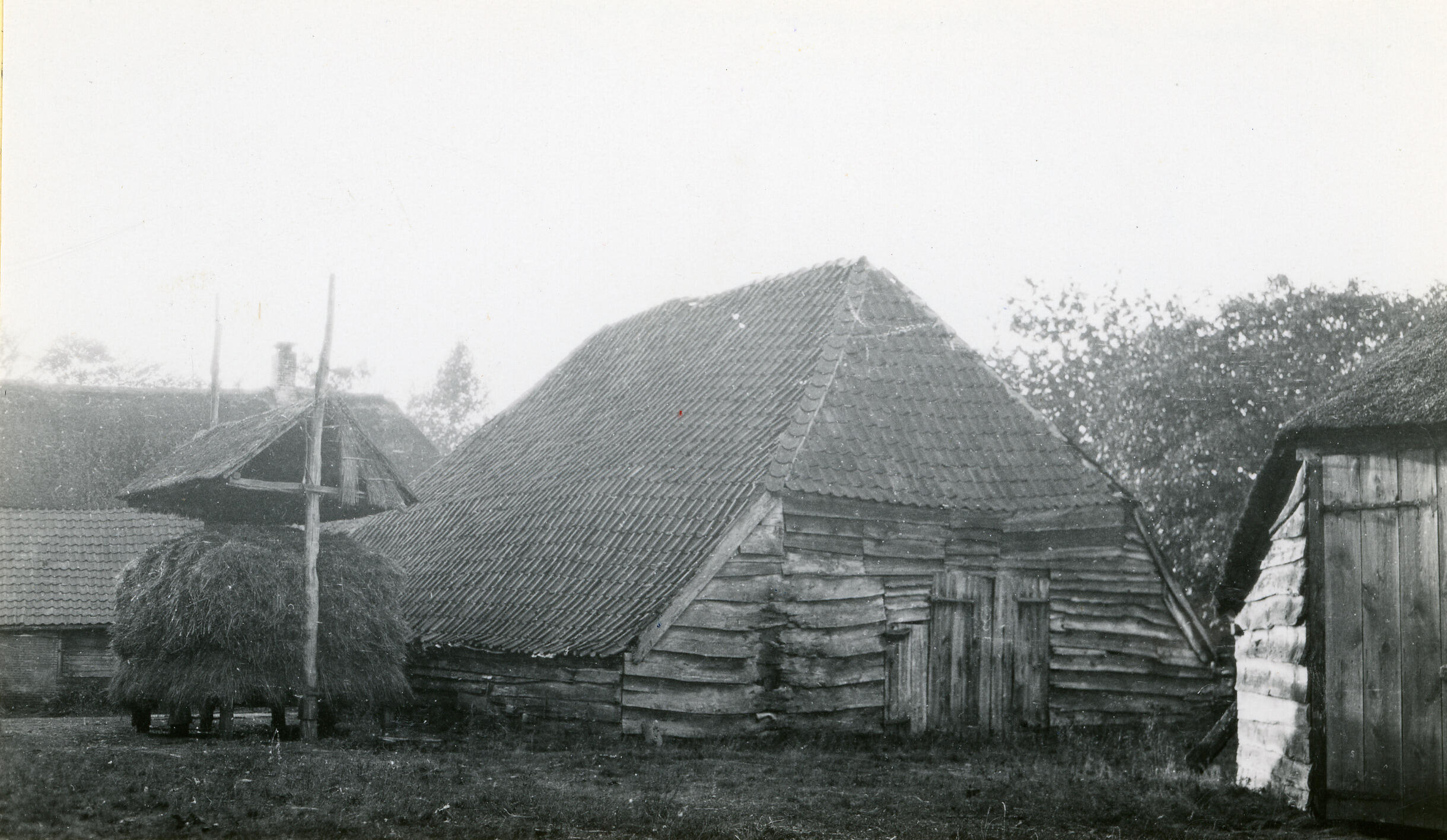 Schuren en hooiberg in De Kraats, 1929 (zwart-wit foto)