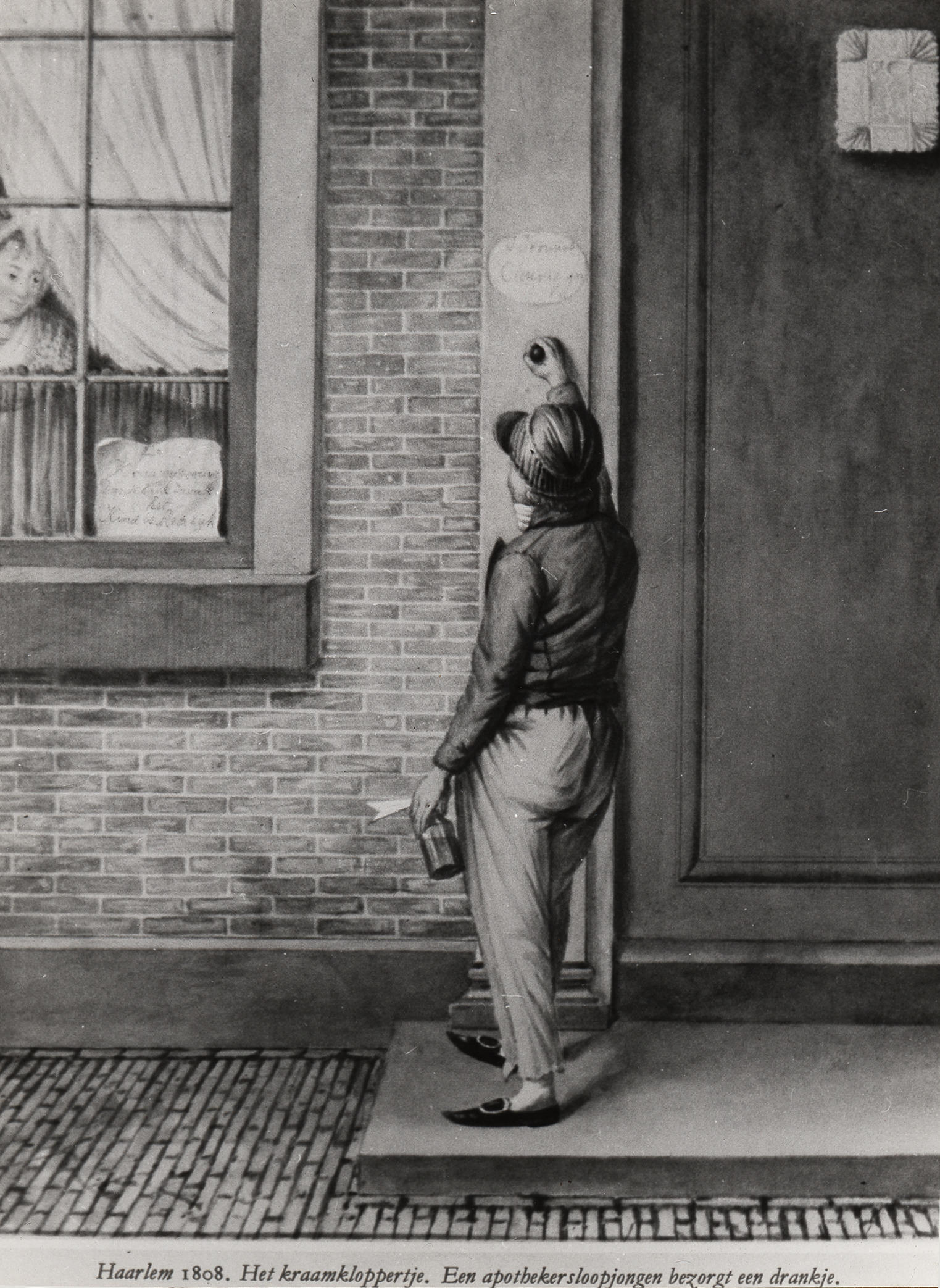 Apothekersloopjongen belt aan (zwart-wit foto)