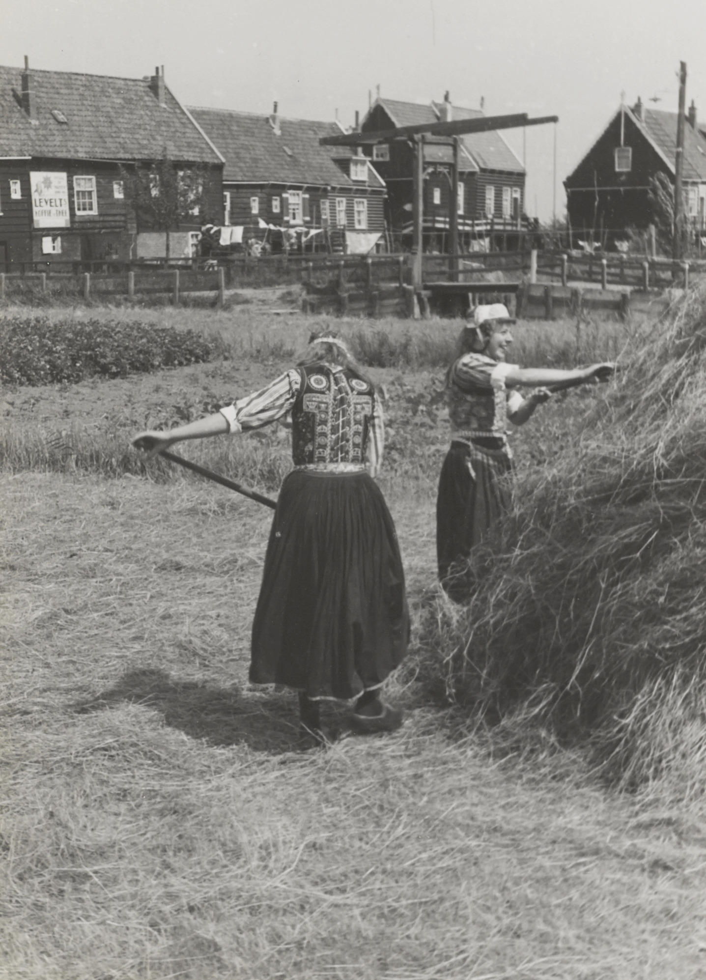 Meisjes aan het hooien, Marken, 1943 (zwart-wit foto)