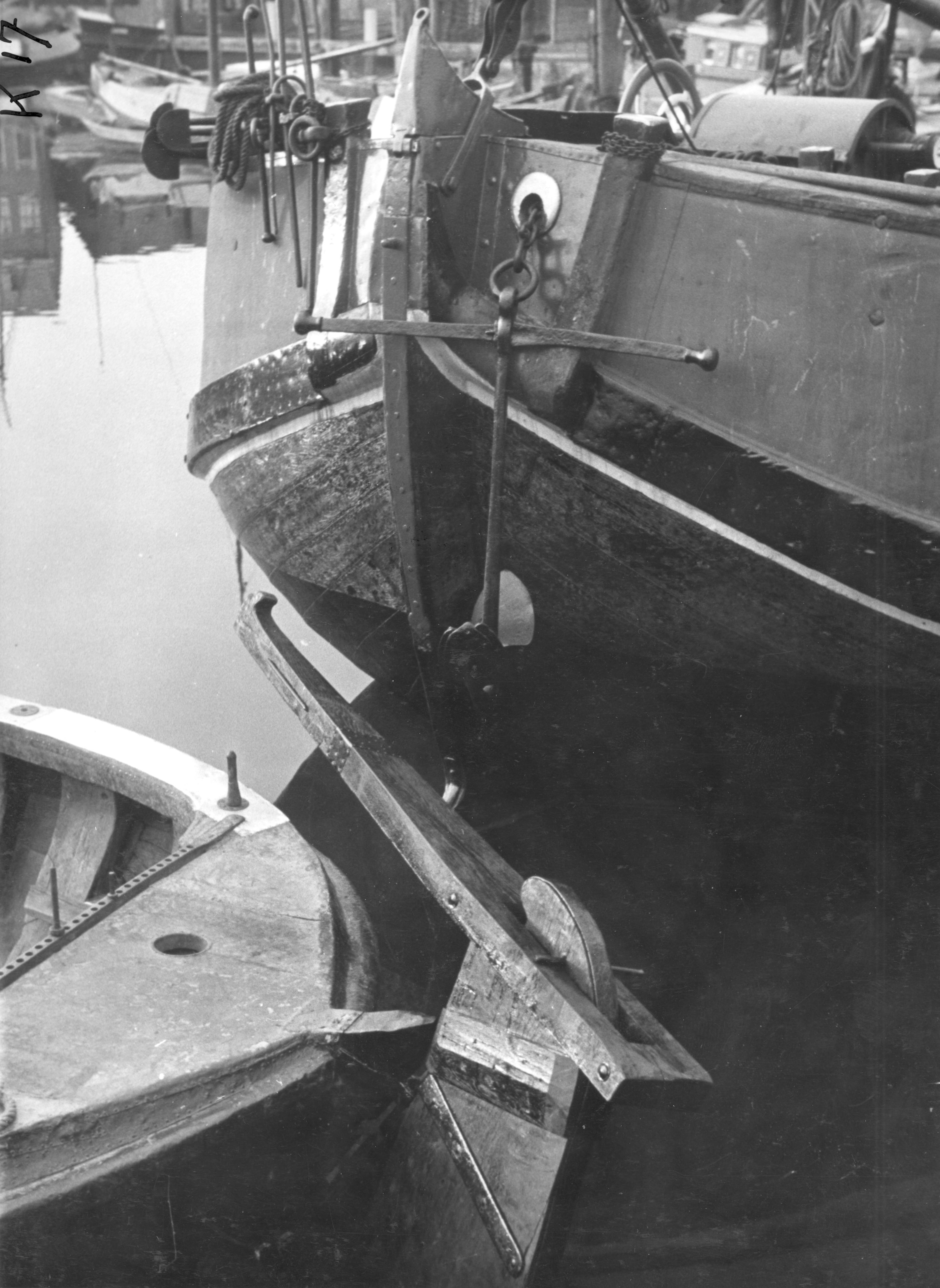 Boeg van een tjalk, Kampen, 1942 (zwart-wit foto)