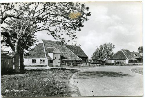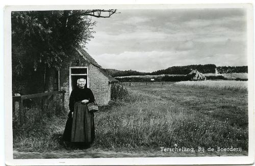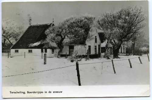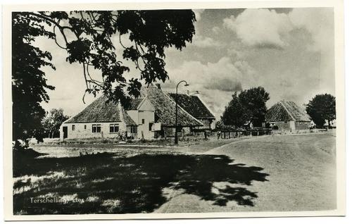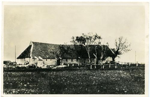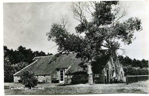 Prentbriefkaart in zwart-wit van een boerderij op Te...