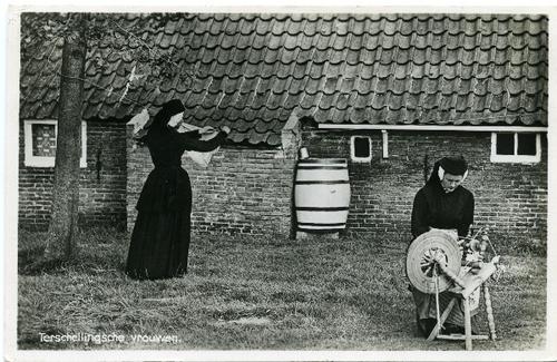 Prentbriefkaart van Terschellinger vrouwen in kleder...
