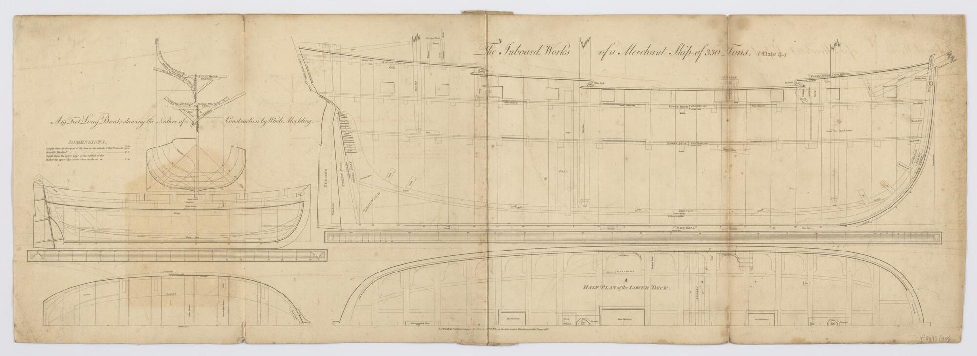 Constructieplan van een drie mast Engelse koopvaarder