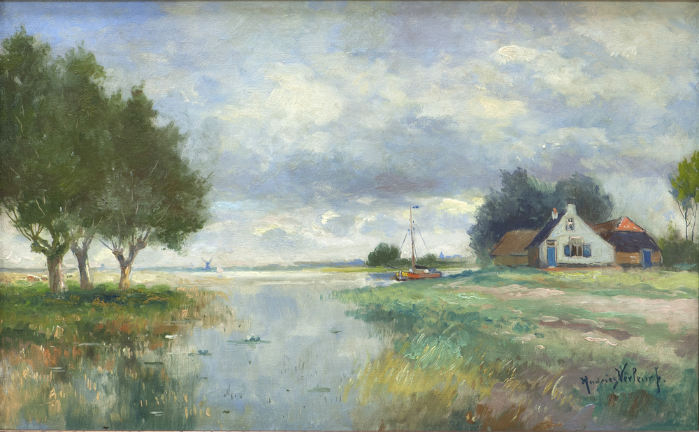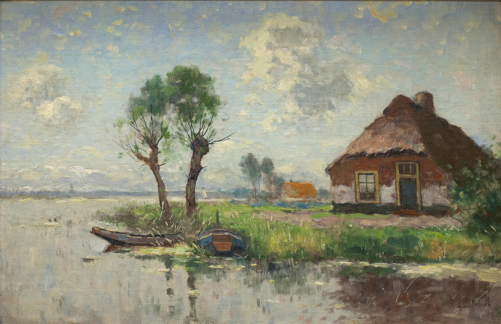 Schilderij met daarop een boerderij aan het water