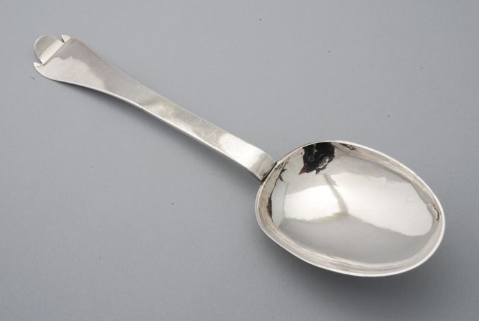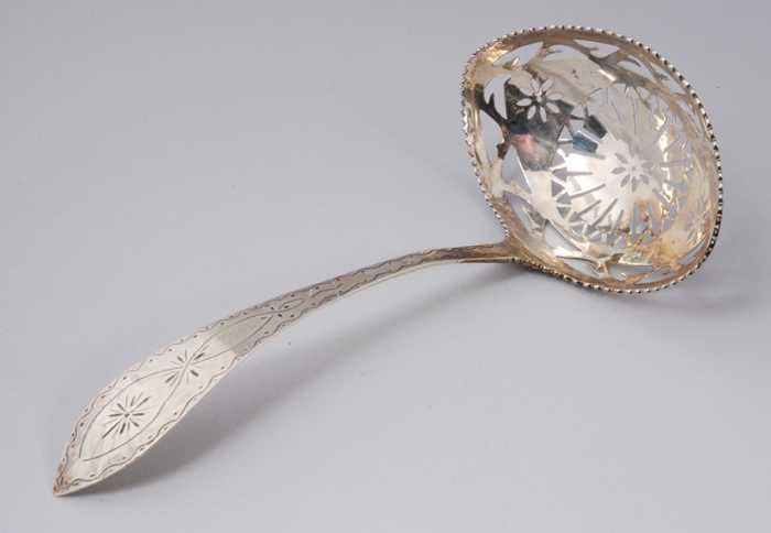 Zilveren strooilepel met opengewerkte bak
