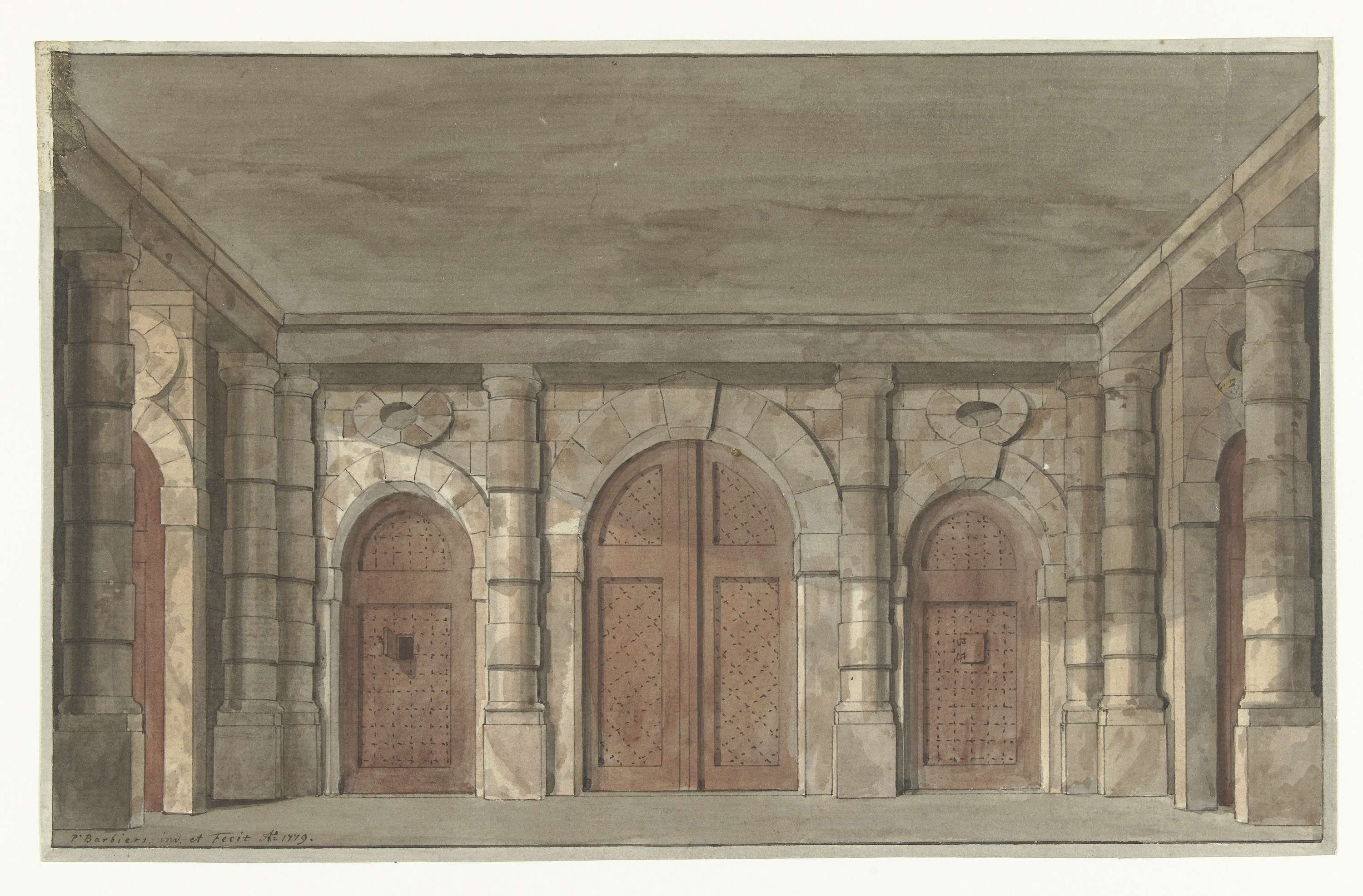 Ontwerp voor een toneeldecor van een voorportaal van...