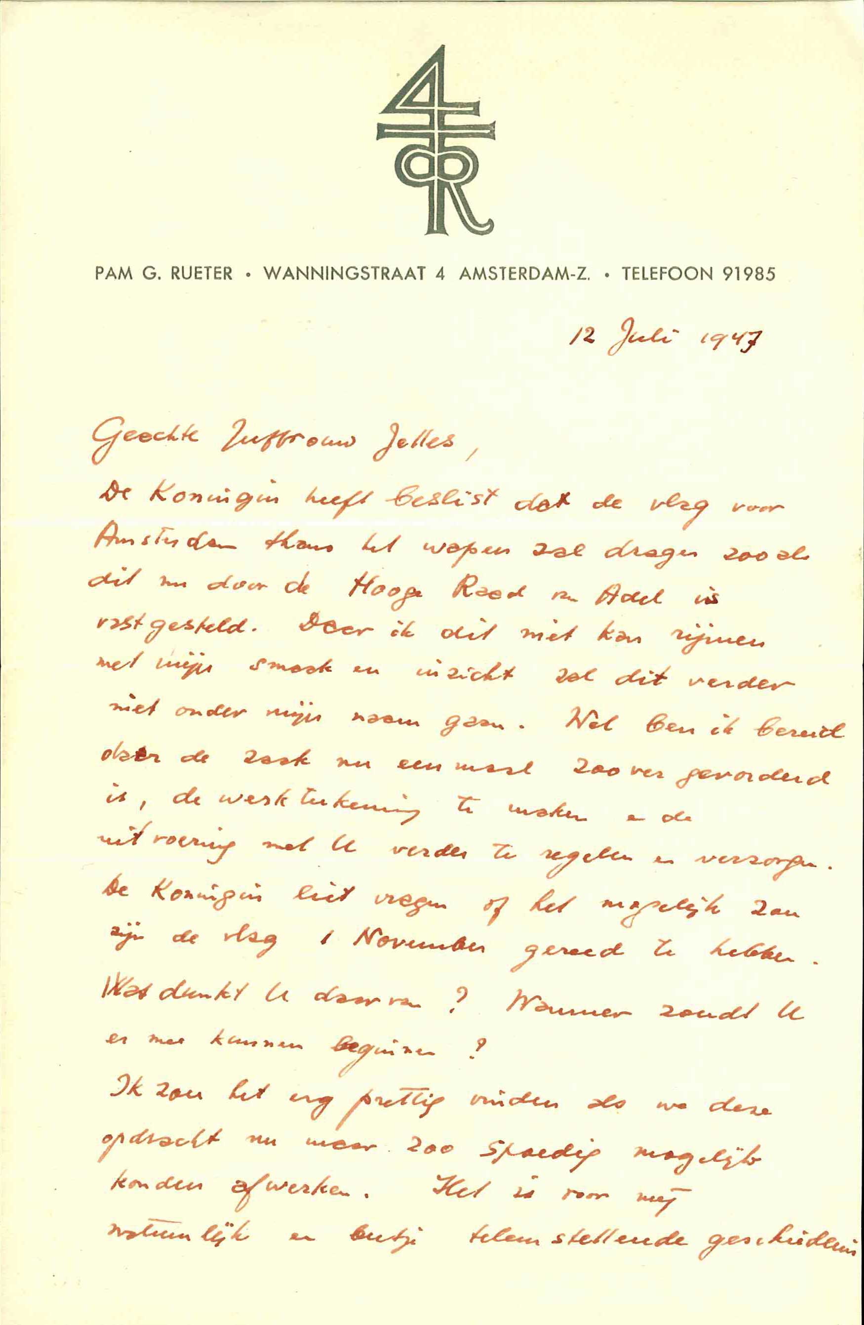 Brief aan Baukje Jelles over deviesvlag stad Amsterdam