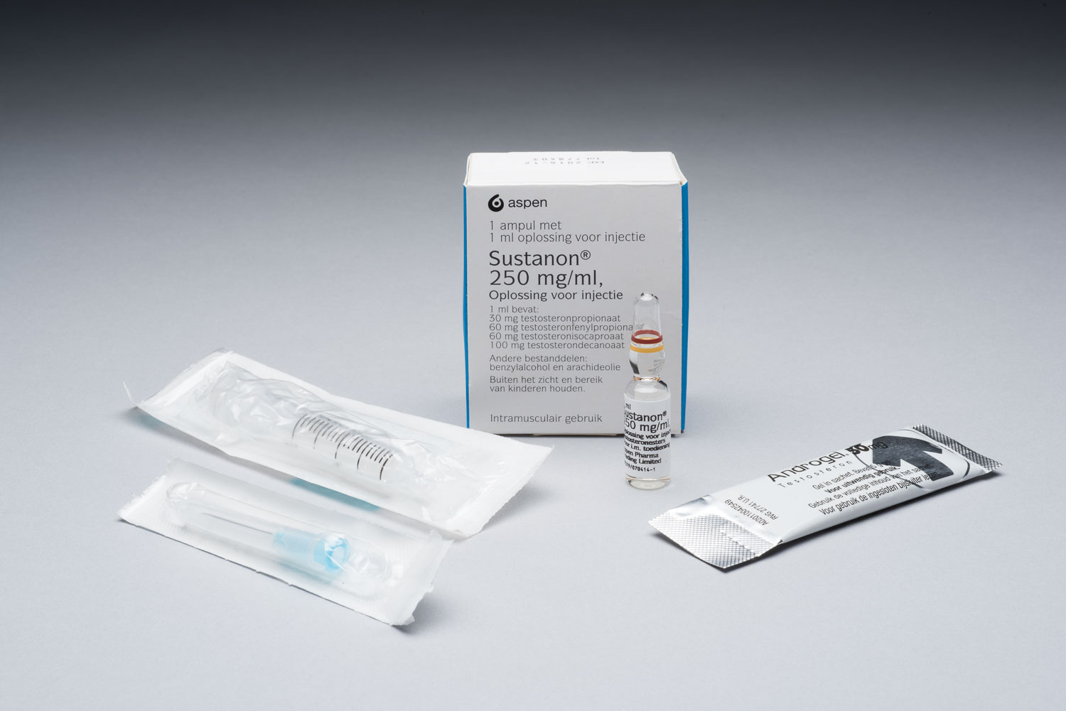 Sustanon en injectiespuiten. Androgel (ensemble) ens...