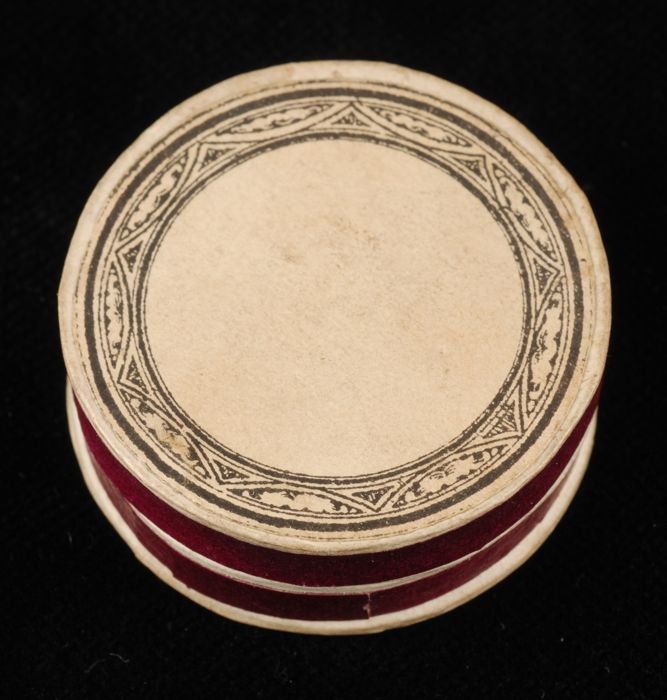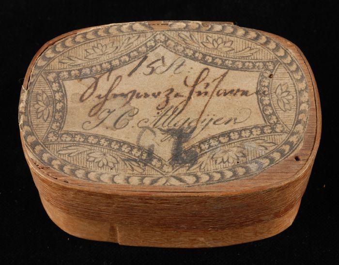 Ovalen spanen pillendoos met op etiket "15 St:, I.C....
