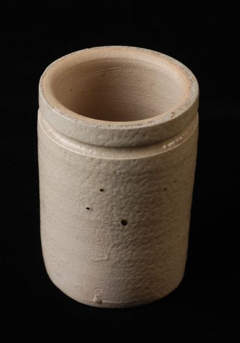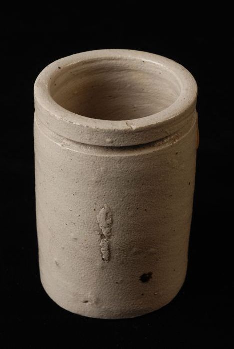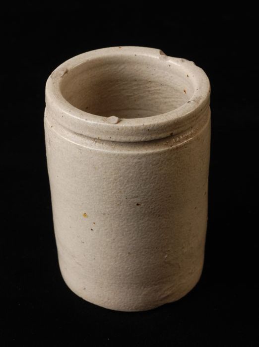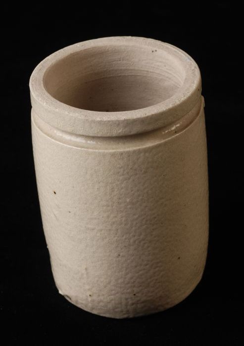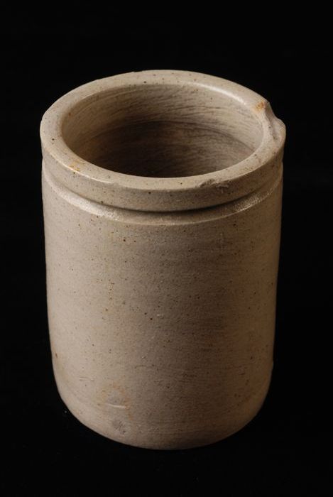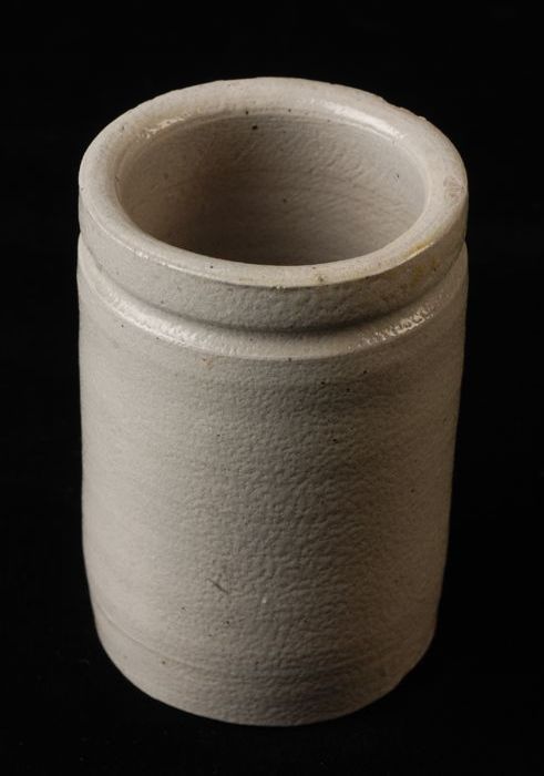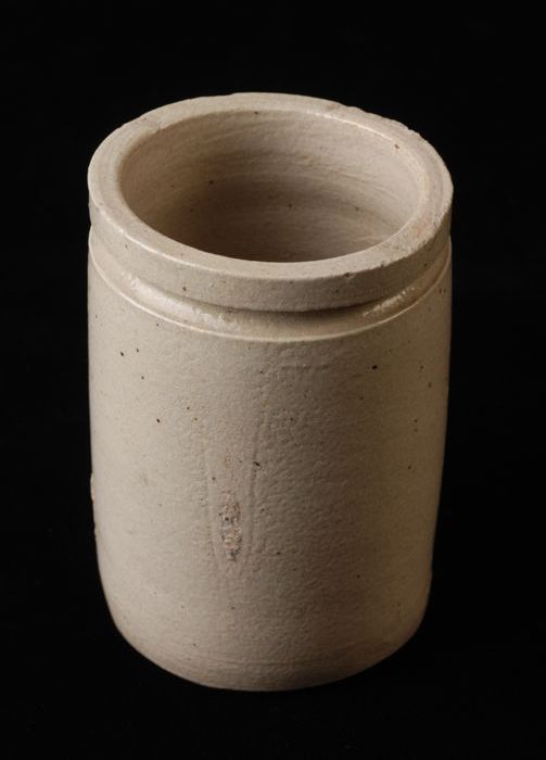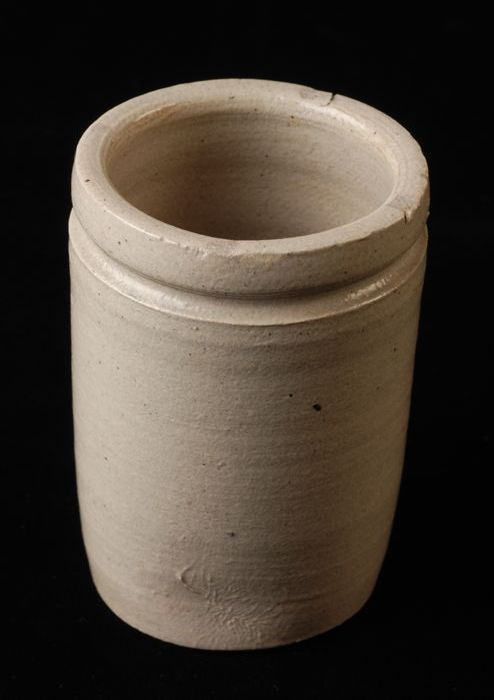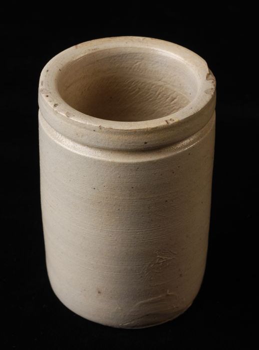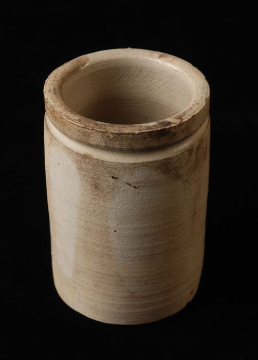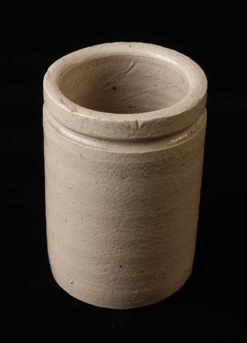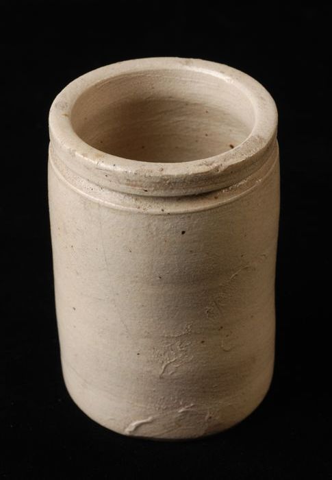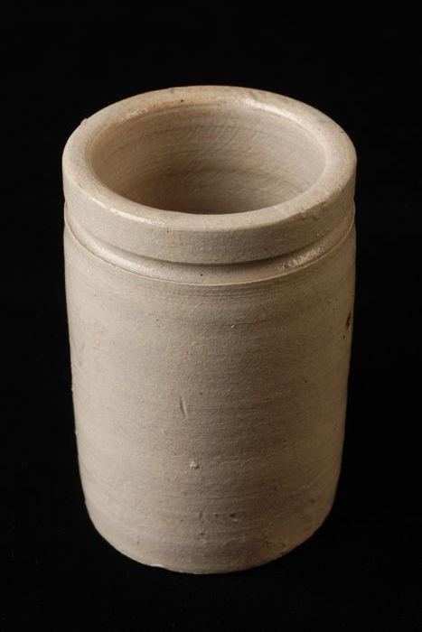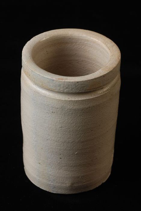 Steengoed zalfpot, cilindrisch met bindgroef rond ha...