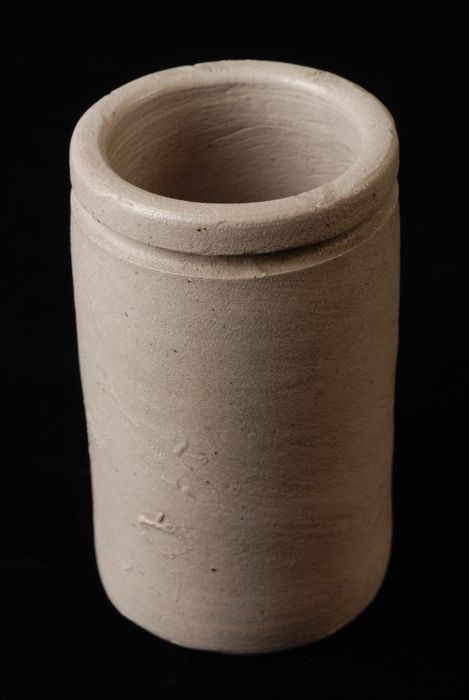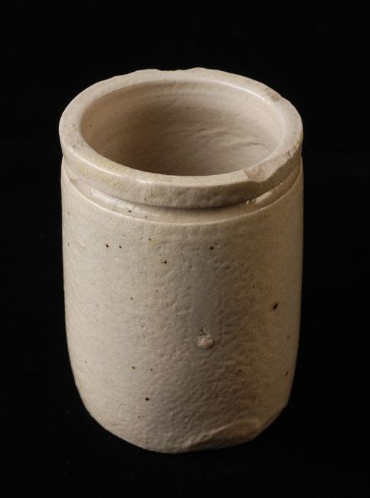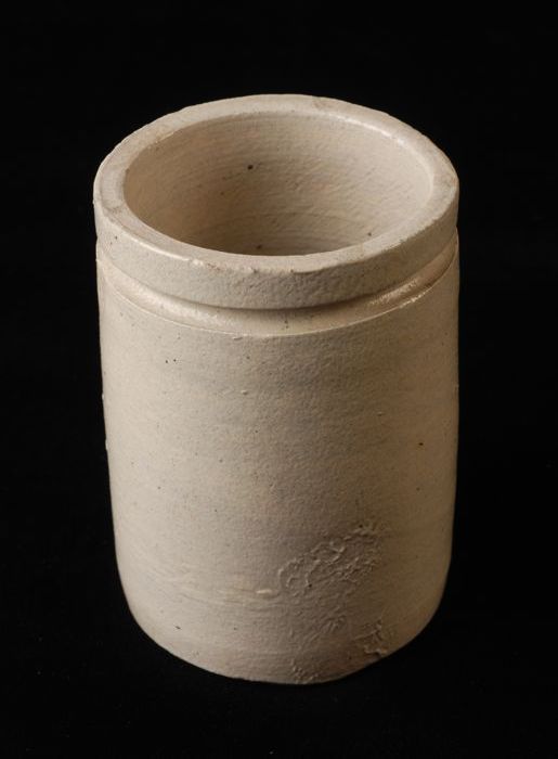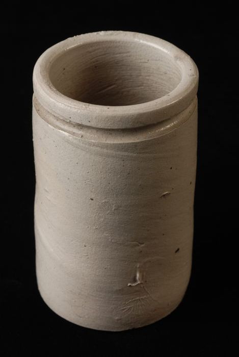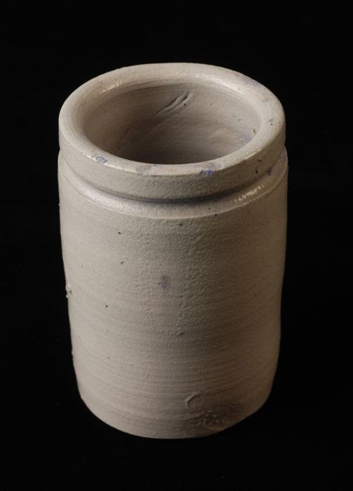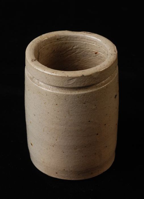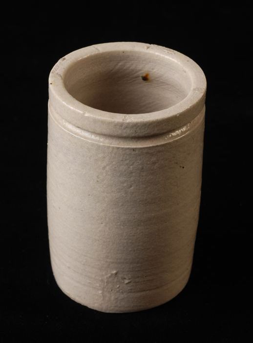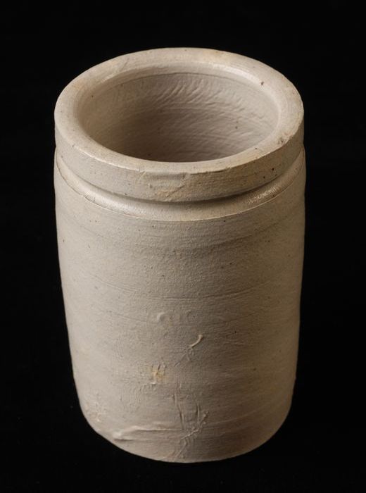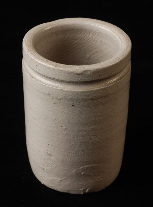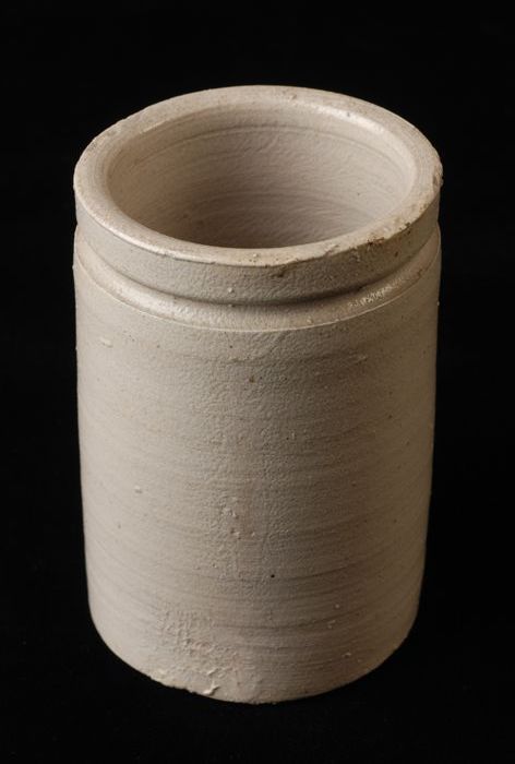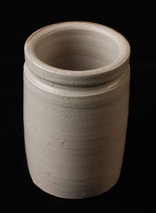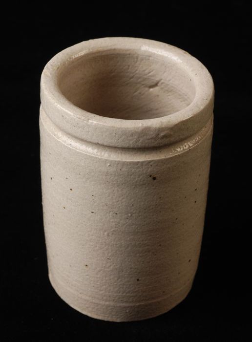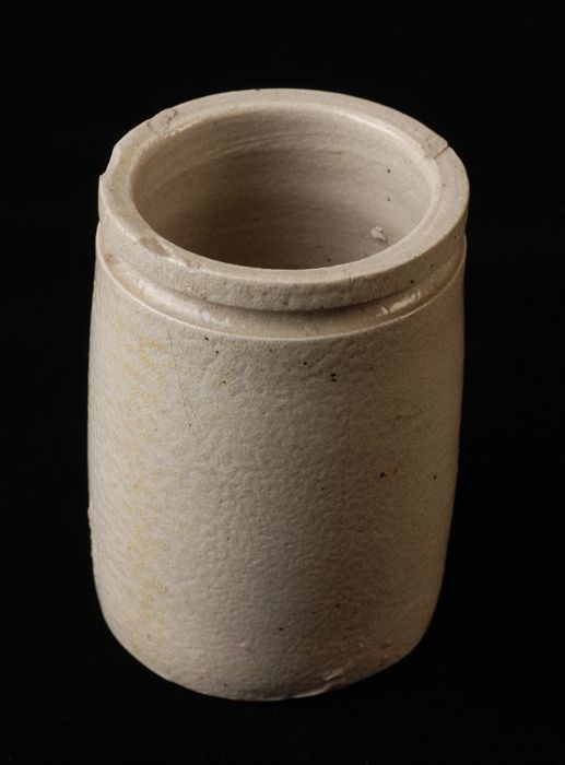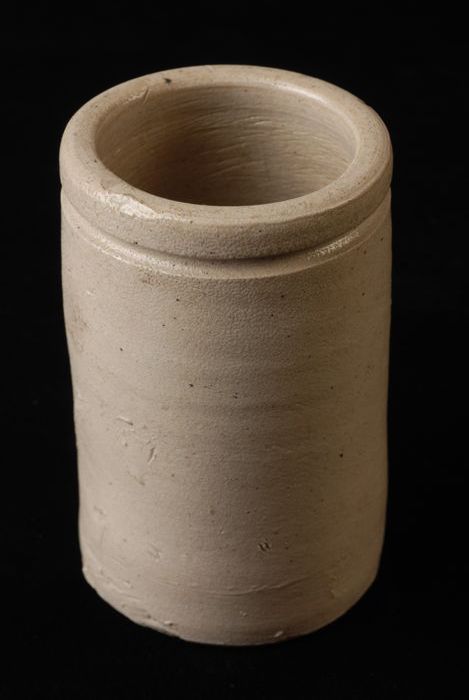 Steengoed zalfpot, cilindrisch met bindgroef rond ha...