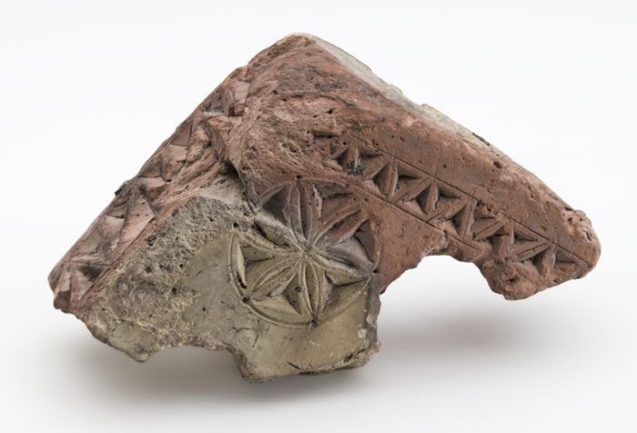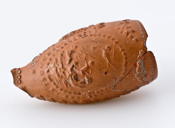 Rode kleipijp in reliëf versierd met twee medaillons...