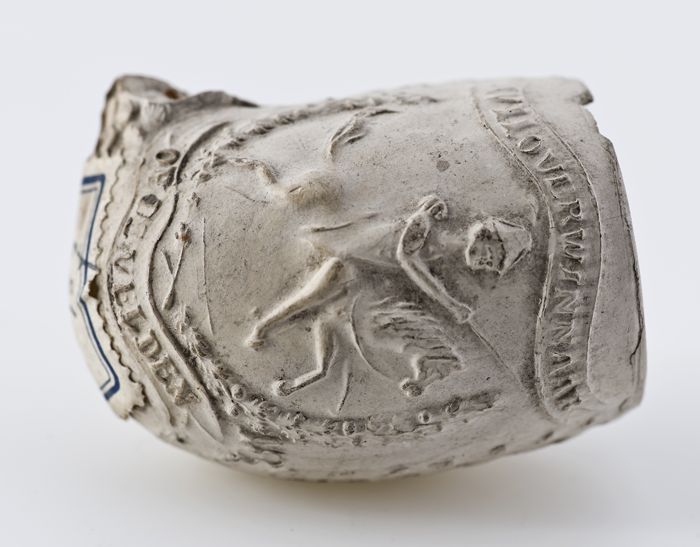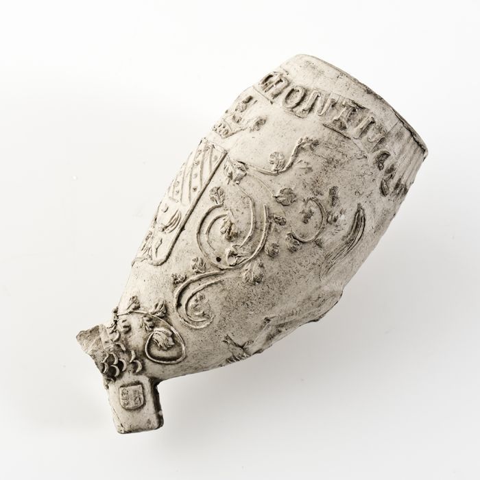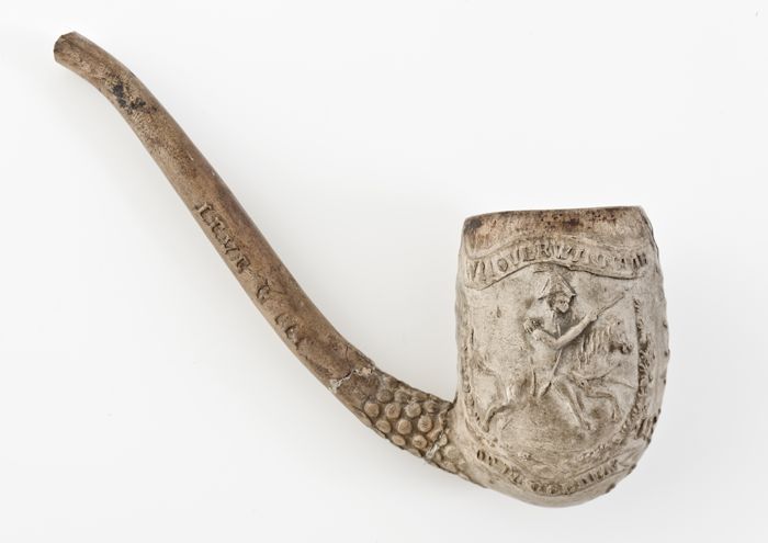 Witte kleipijp in reliëf versierd met het stadswapen...
