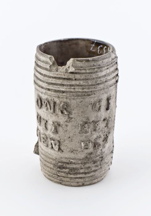 Witte kleipijp in de vorm van een vat met hoepels en...