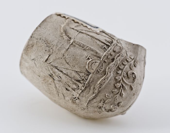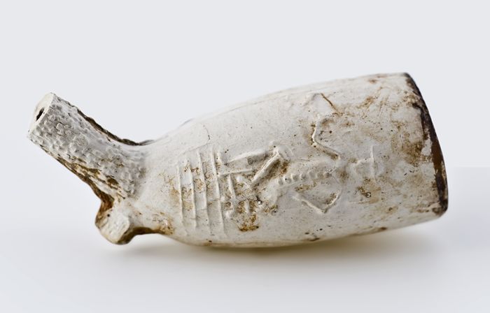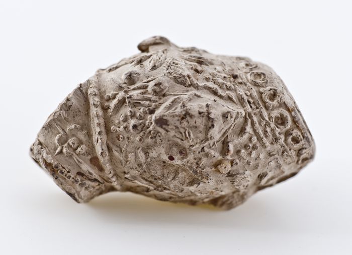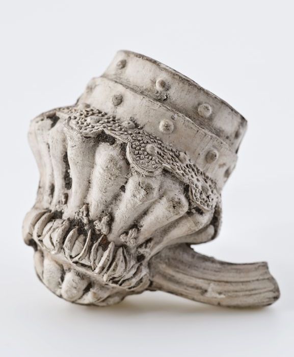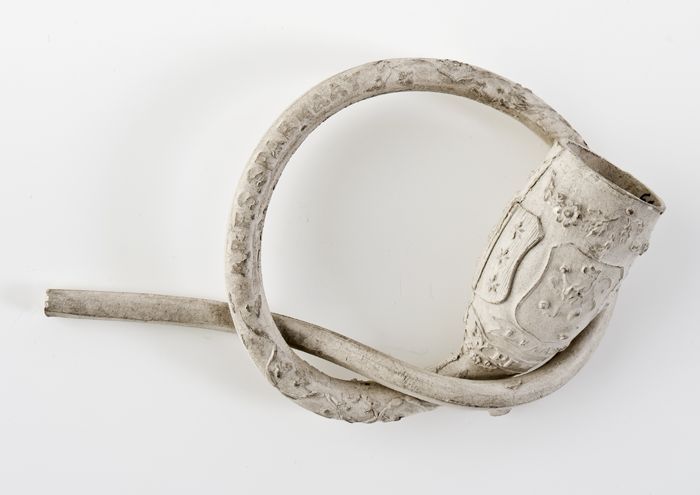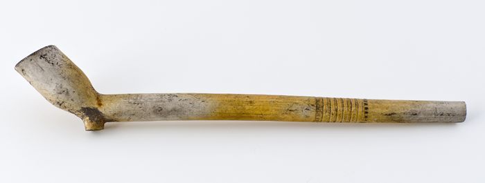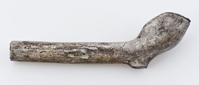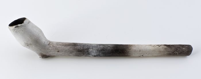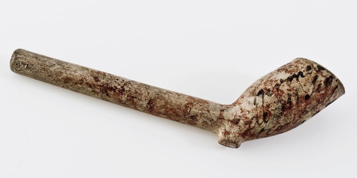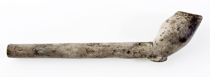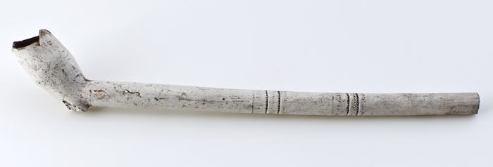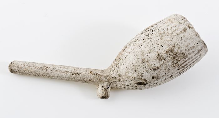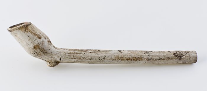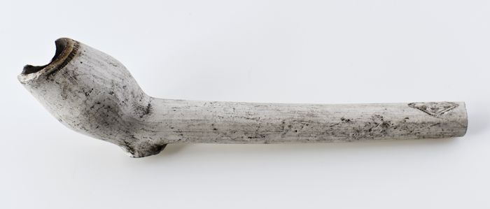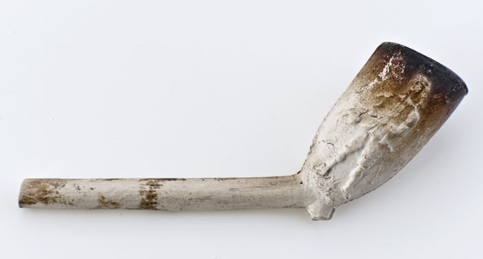 Witte kleipijp in reliëf versierd met een omgekeerde...