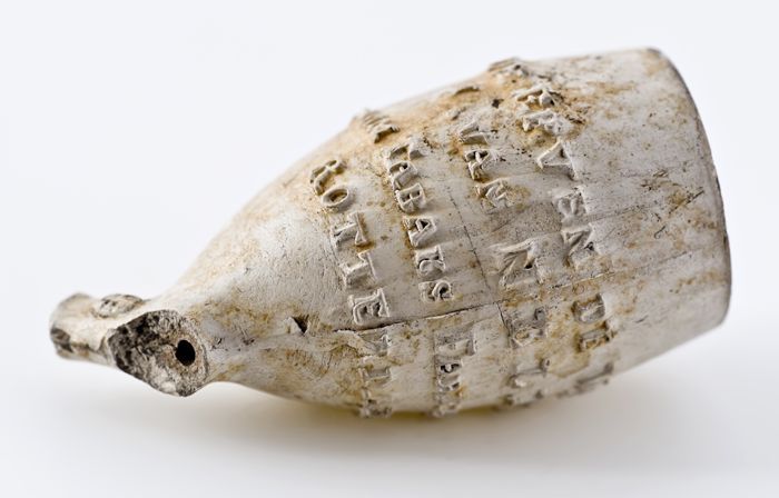 Witte kleipijp in reliëf voorzien van tekst, reclame...