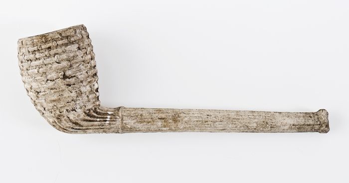 Witte kleipijp in de vorm van een gevlochten mand, r...