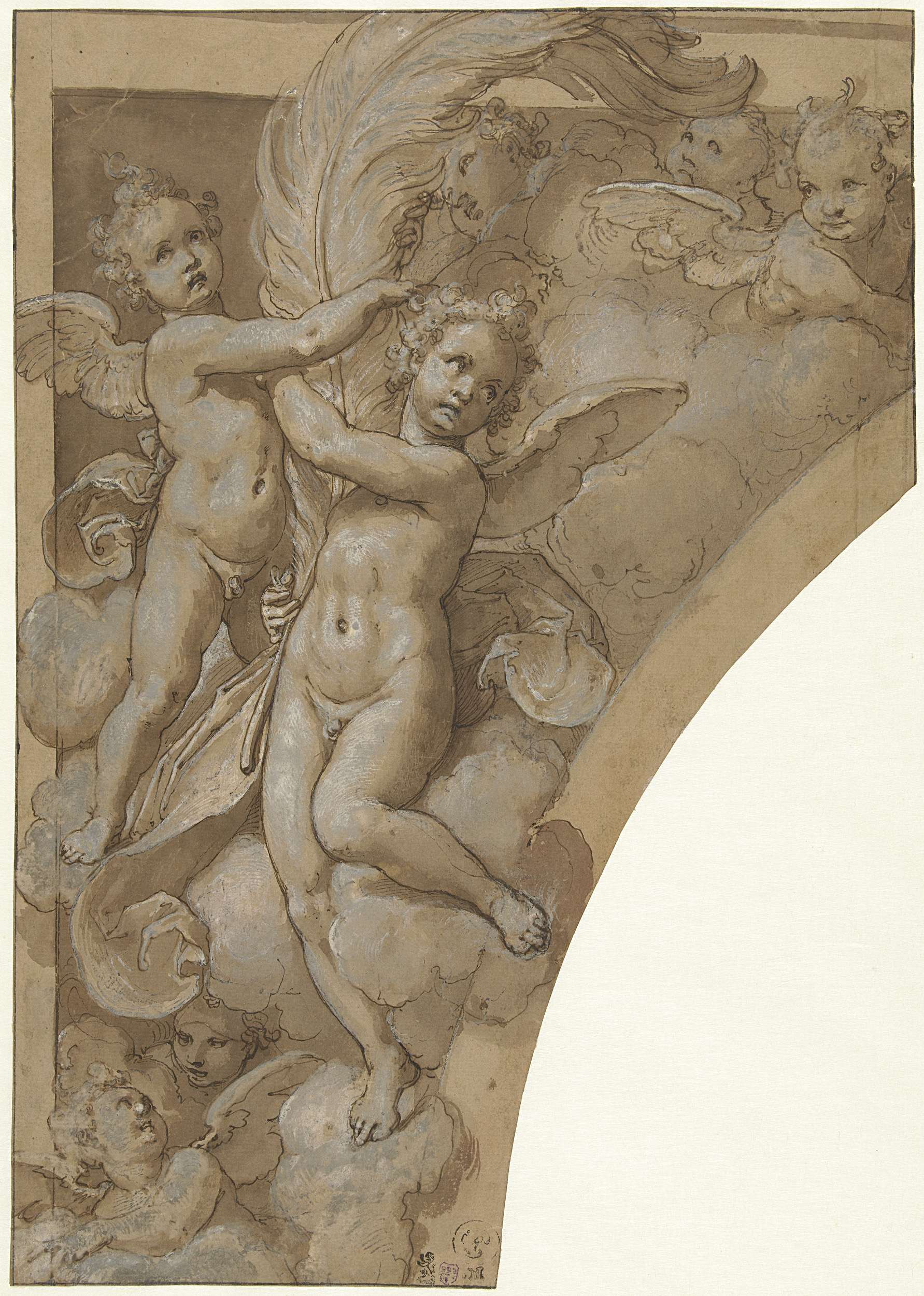 Groep engelen, waarvan twee met een grote veer