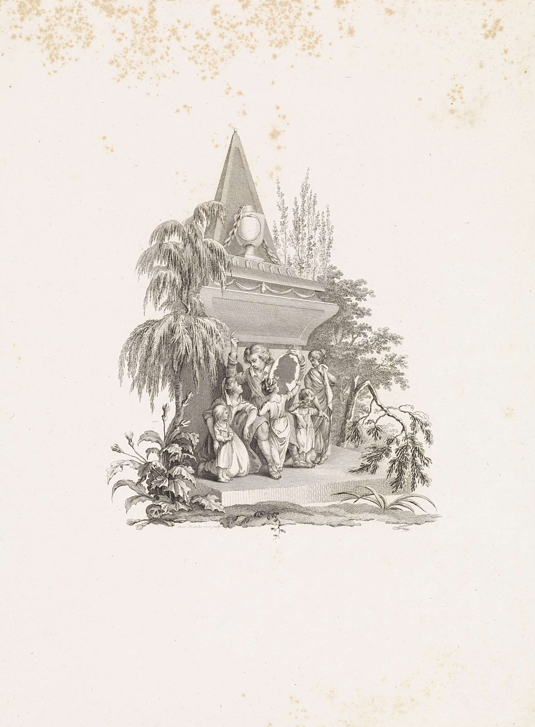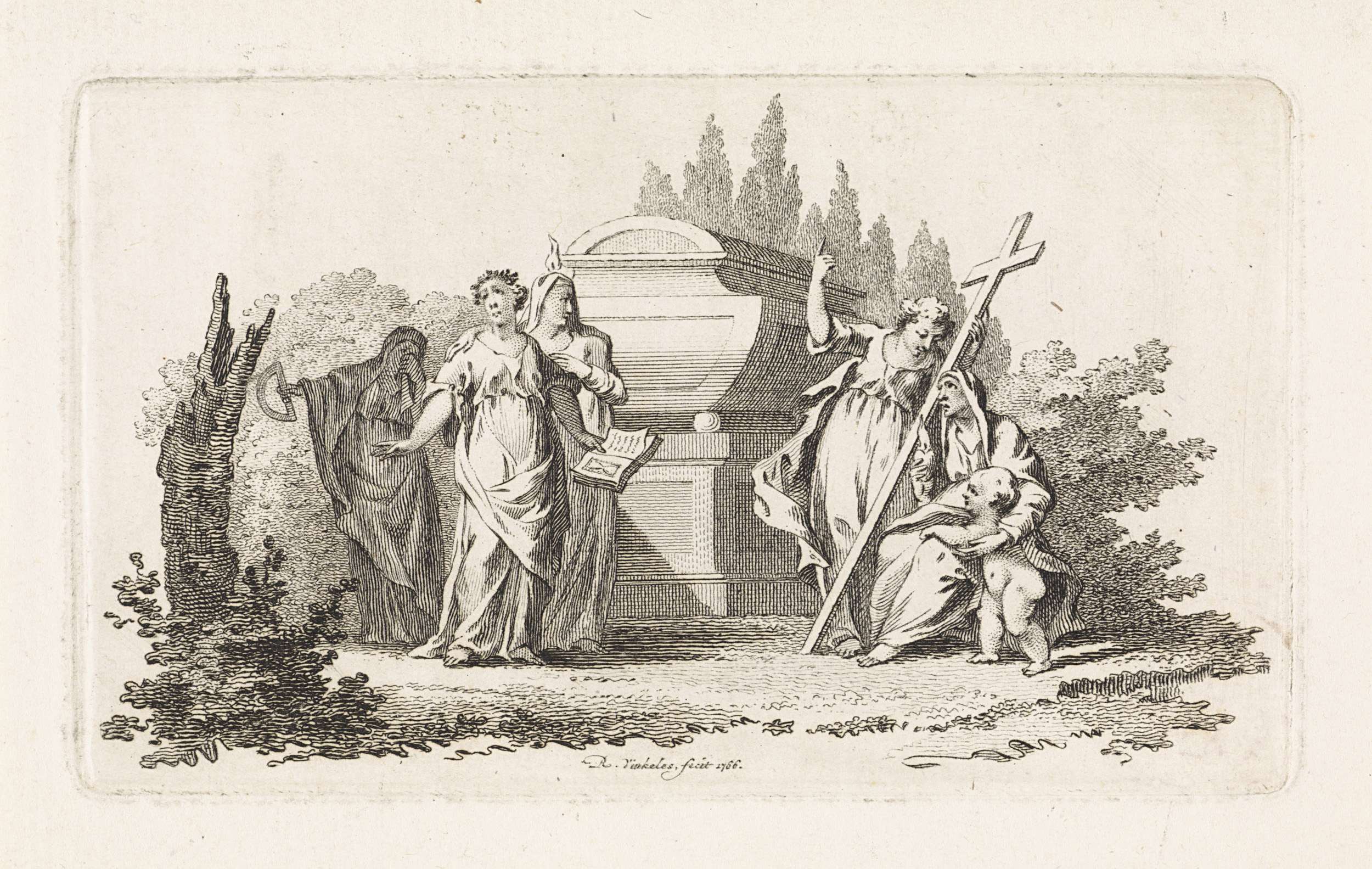 Vijf vrouwelijke personificaties bij een grafmonument