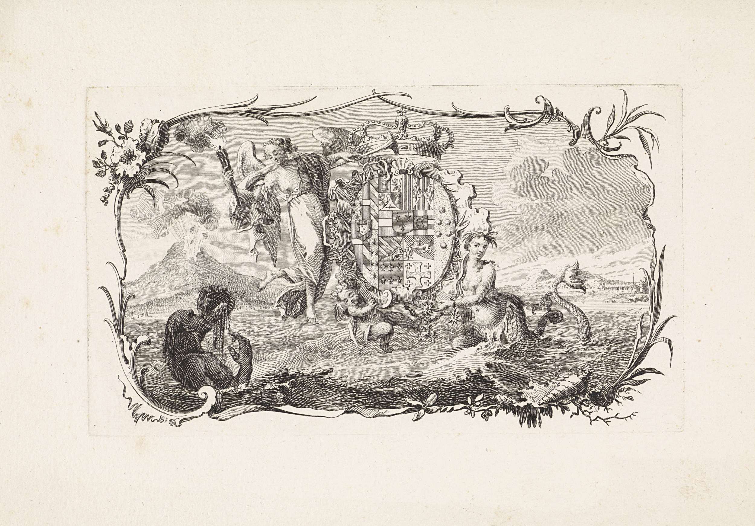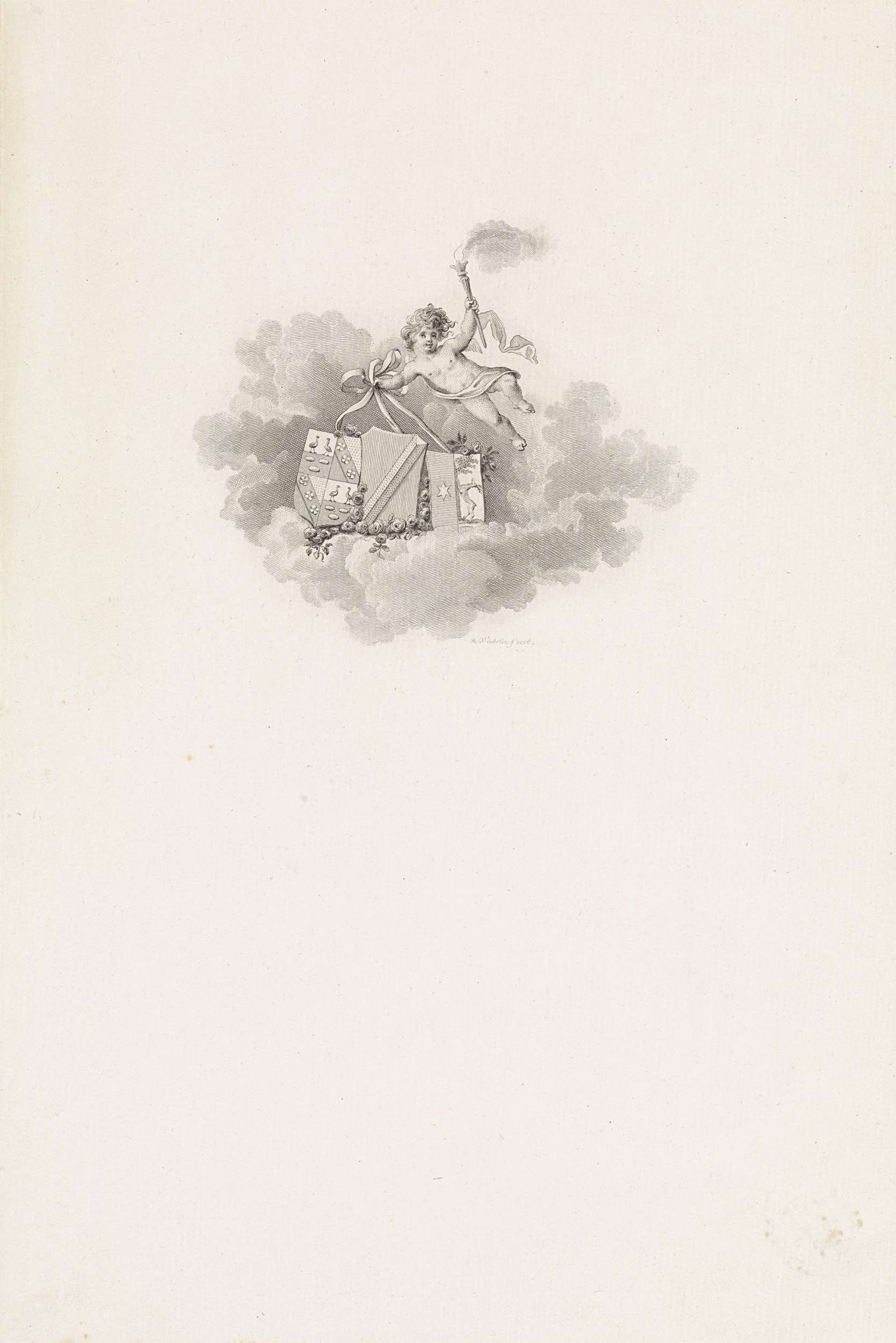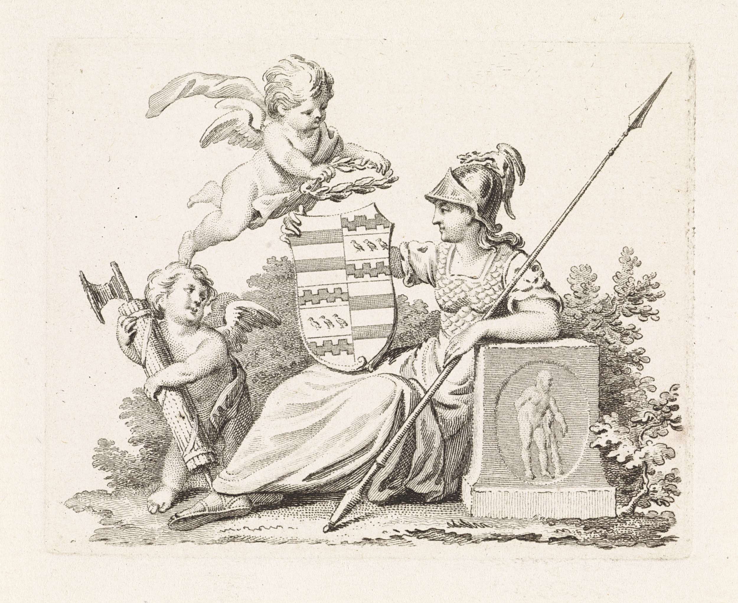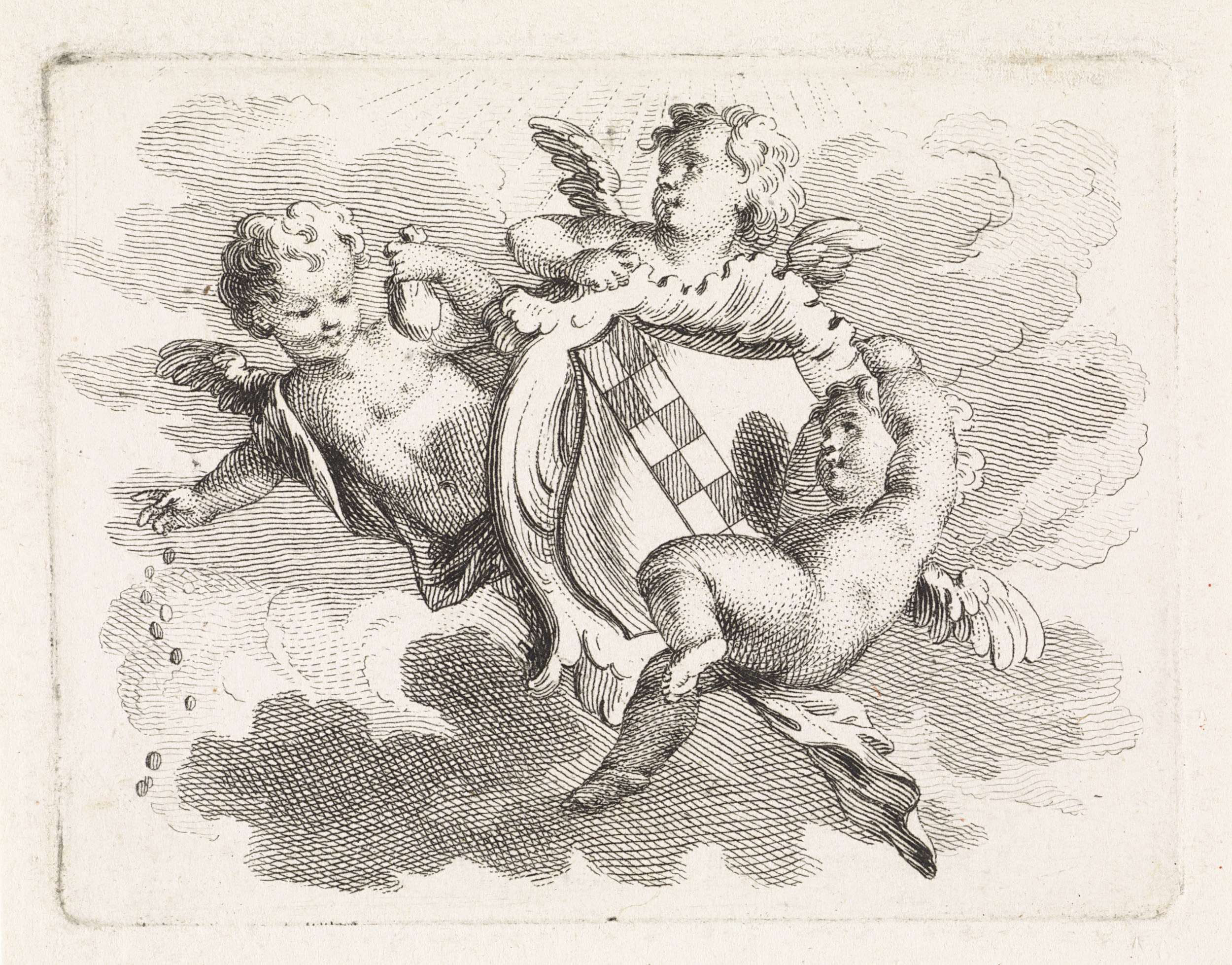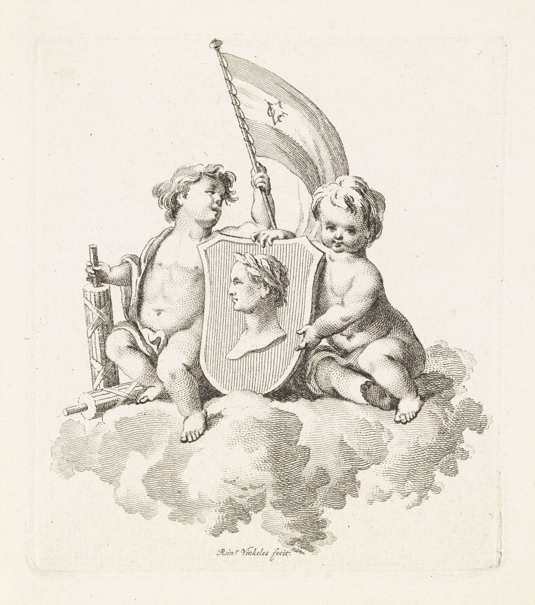 Putti met een familiewapen en een banier van de V.O....