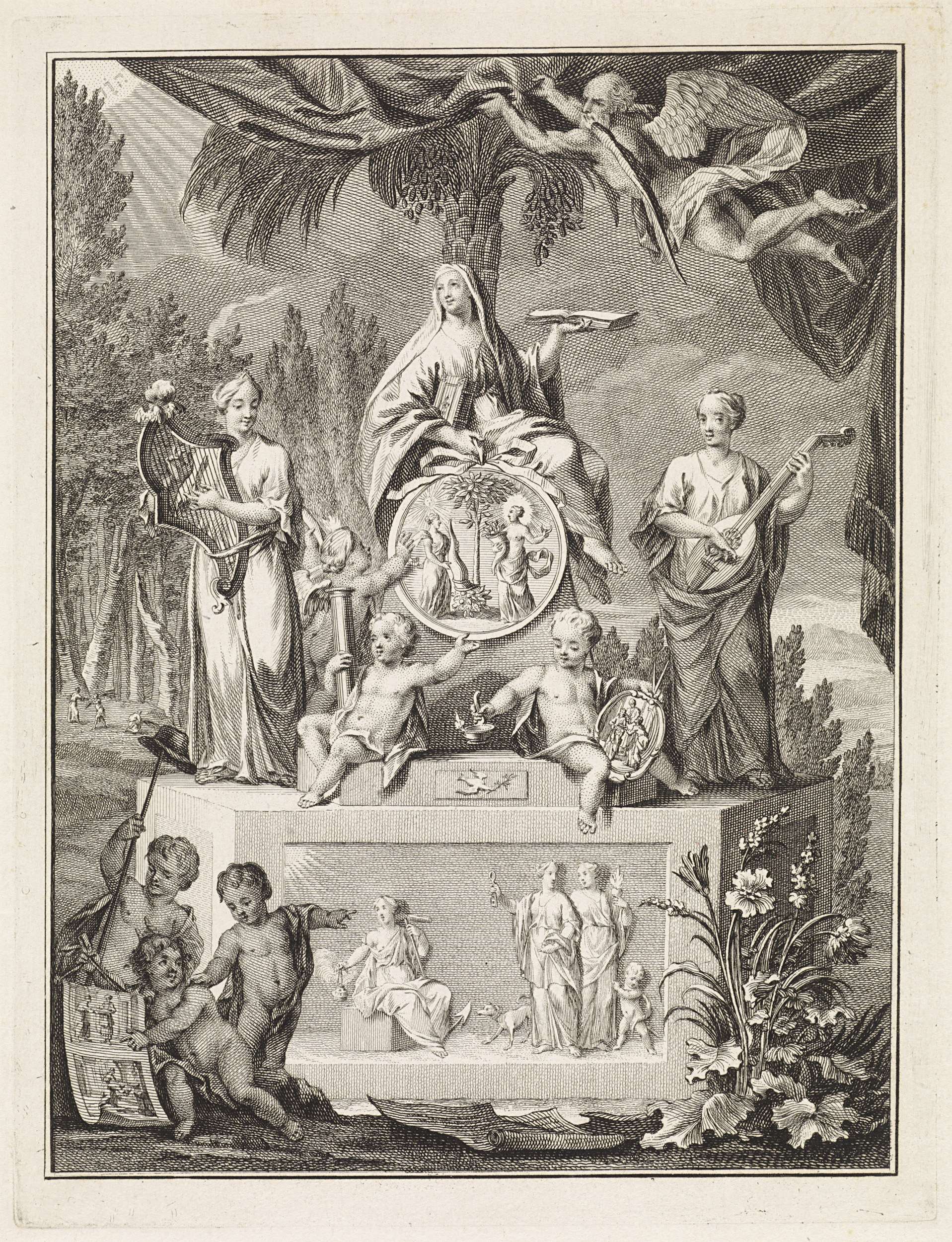 Harpspelende vrouw met vijf musicerende putti