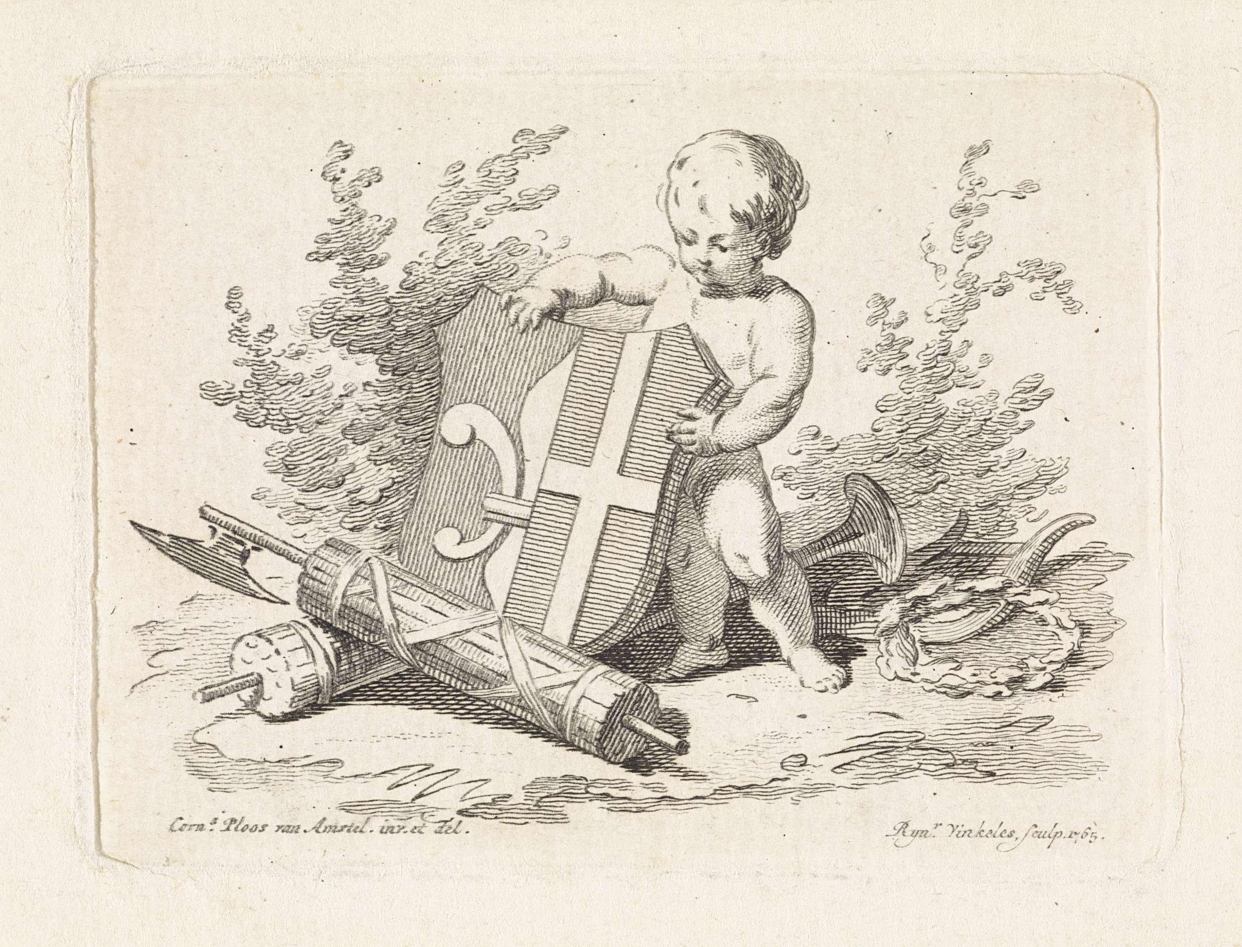 Putto met drie wapenschilden en een toorts